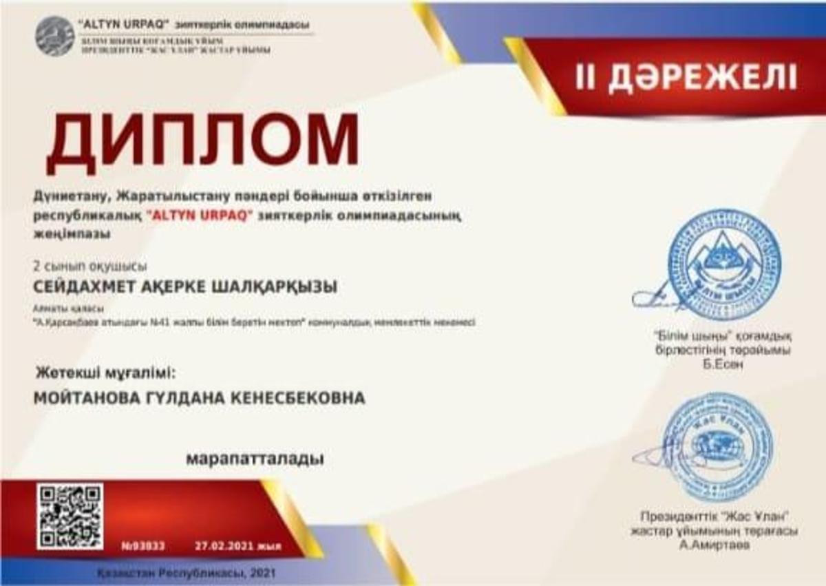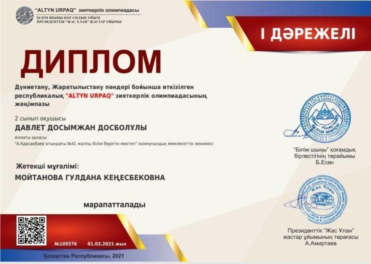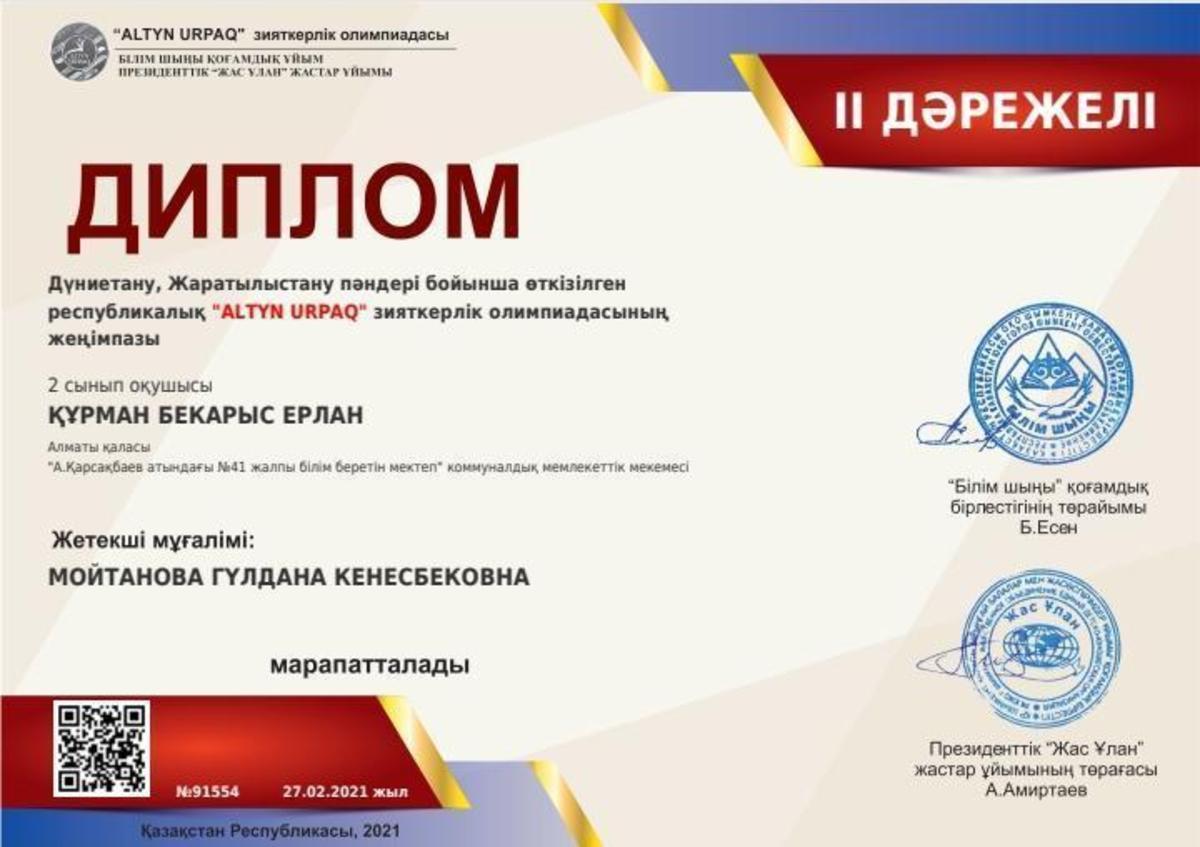 08 сәуір 2021 0 1 2 3 4 5 "Altyn Urpaq"зияткерлік олимпиадасының жеңімпаздары А.Қарсақбаев атындағы №41 ЖББ мектеп 2-сынып оқушылары дүниетану, жаратылыстану пәндері бойынша өткізілген республикалық "Altyn Urpaq"зияткерлік олимпиадасының жеңімпаздары дипломмен марапатталды.