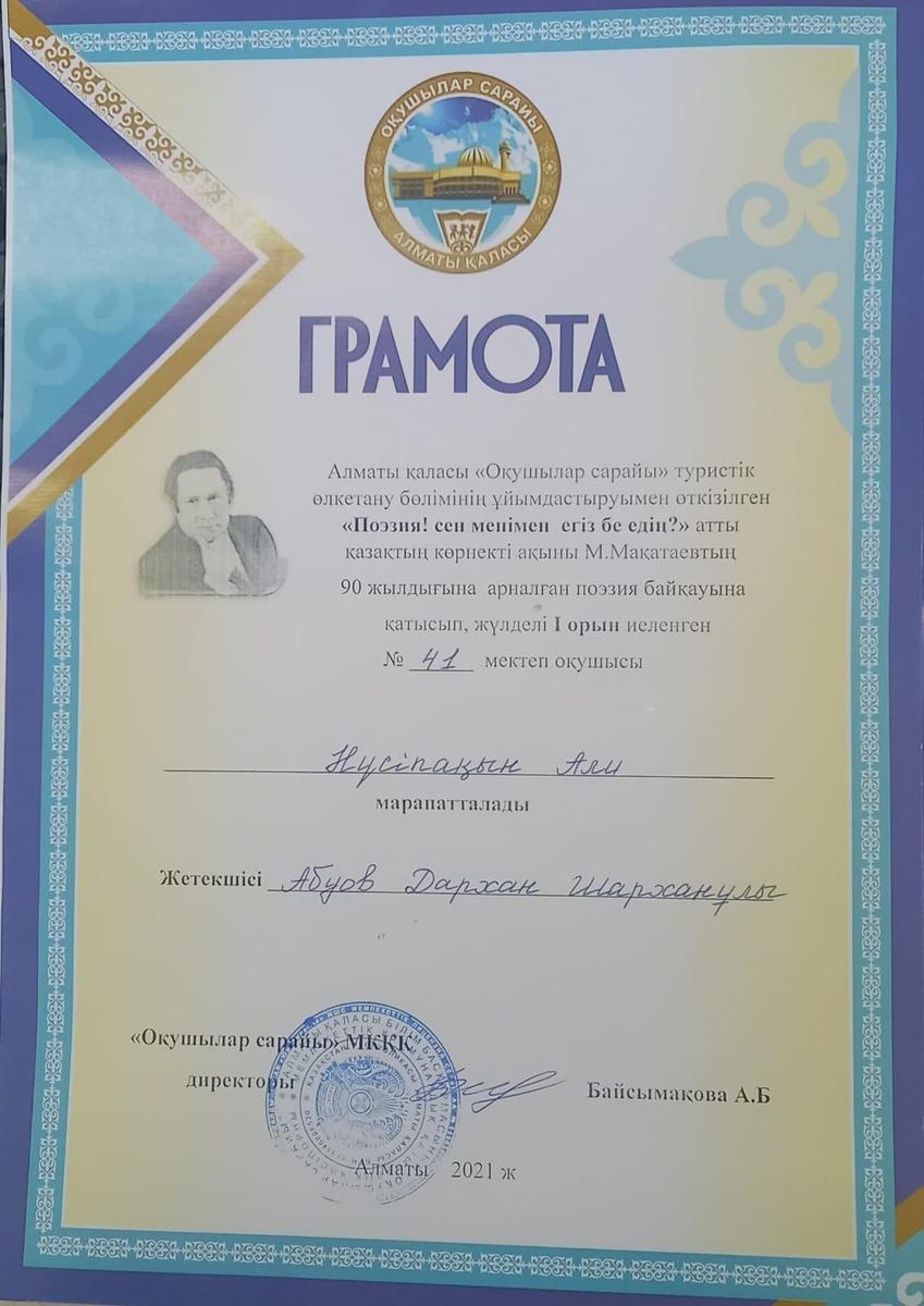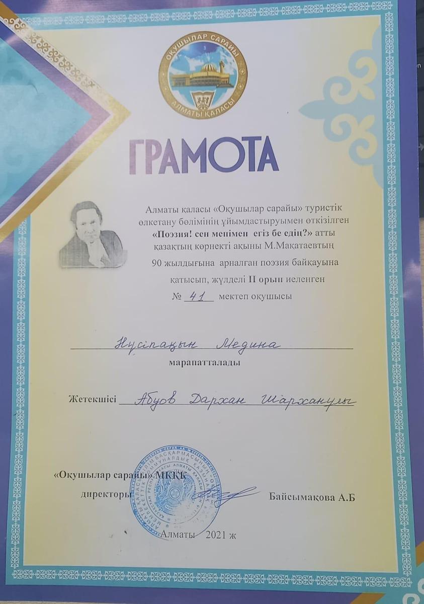 Алматы қаласы "Оқушылар сарайы" туристік өлкетану бөлімінің ұйымдастыруымен өткізілген "Поэзия! сен менімен егіз бе едің?" атты қазақтың көрнекті ақыны М.Мақатаевтың 90 жылдығына арналған поэзия байқауына қатысып, жүлделі І,ІІ орынға иеленгені үшін А. Қарсақбаев атындағы №41 ЖББ мектеп оқушылары Нүсіпақын Али мен Нүсіпақын Медина марапатталды. Жеңістерің құтты болсын!