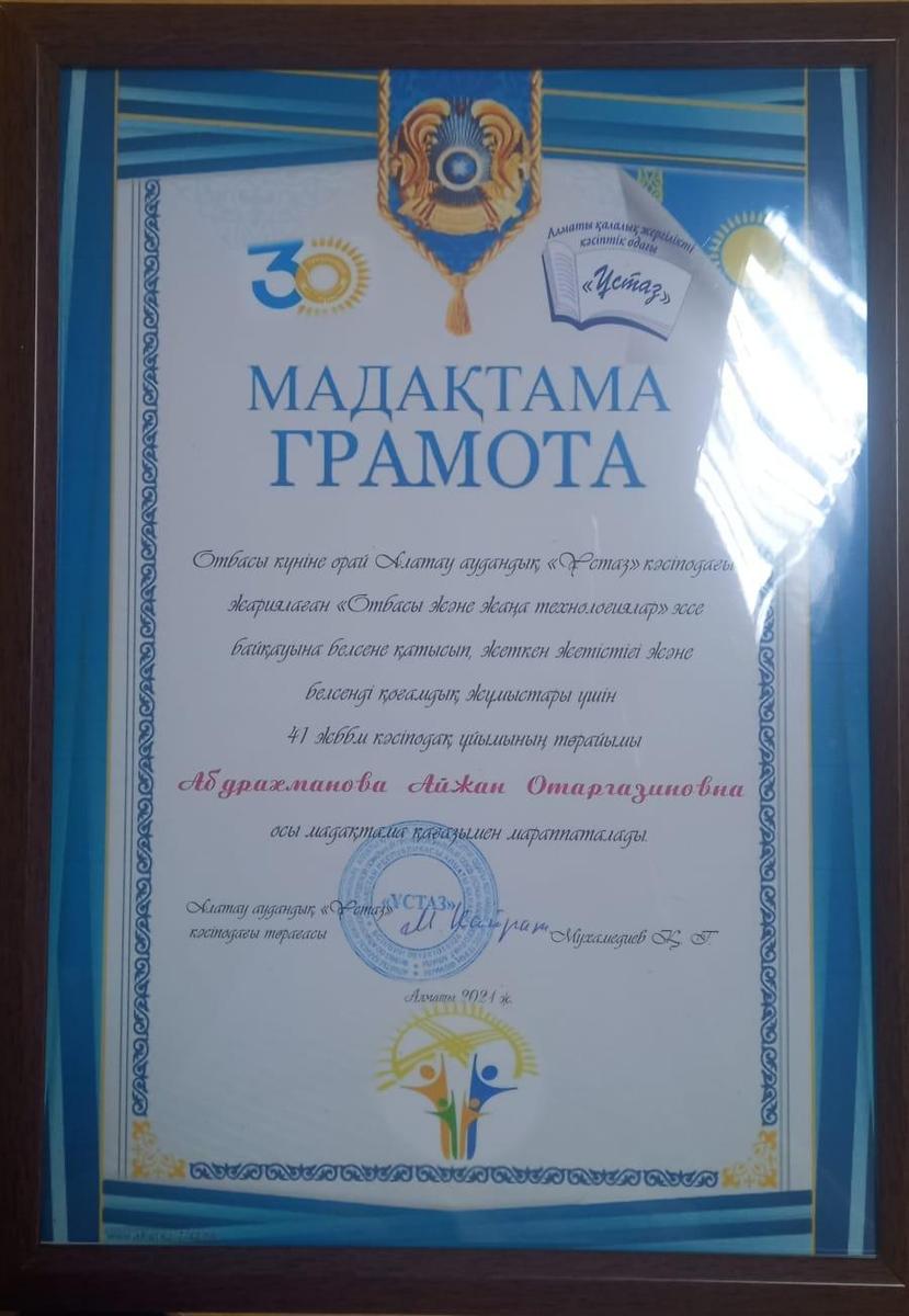 Отбасы күніне орай Алатау аудандық "Ұстаз" кәсіподағы жариялаған "Отбасы және жаңа технологиялар" эссе байқауына белсене қатысып, жеткен жетістігі және белсенді қоғамдық жұмыстары үшін 41 жббм кәсіподақ ұйымының төрайымы А.О. Абдрахманова марапатталды.