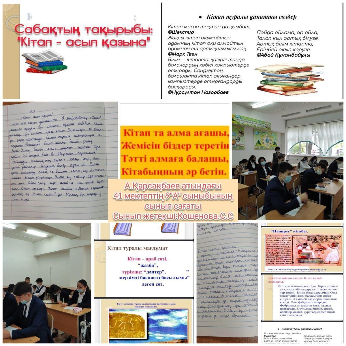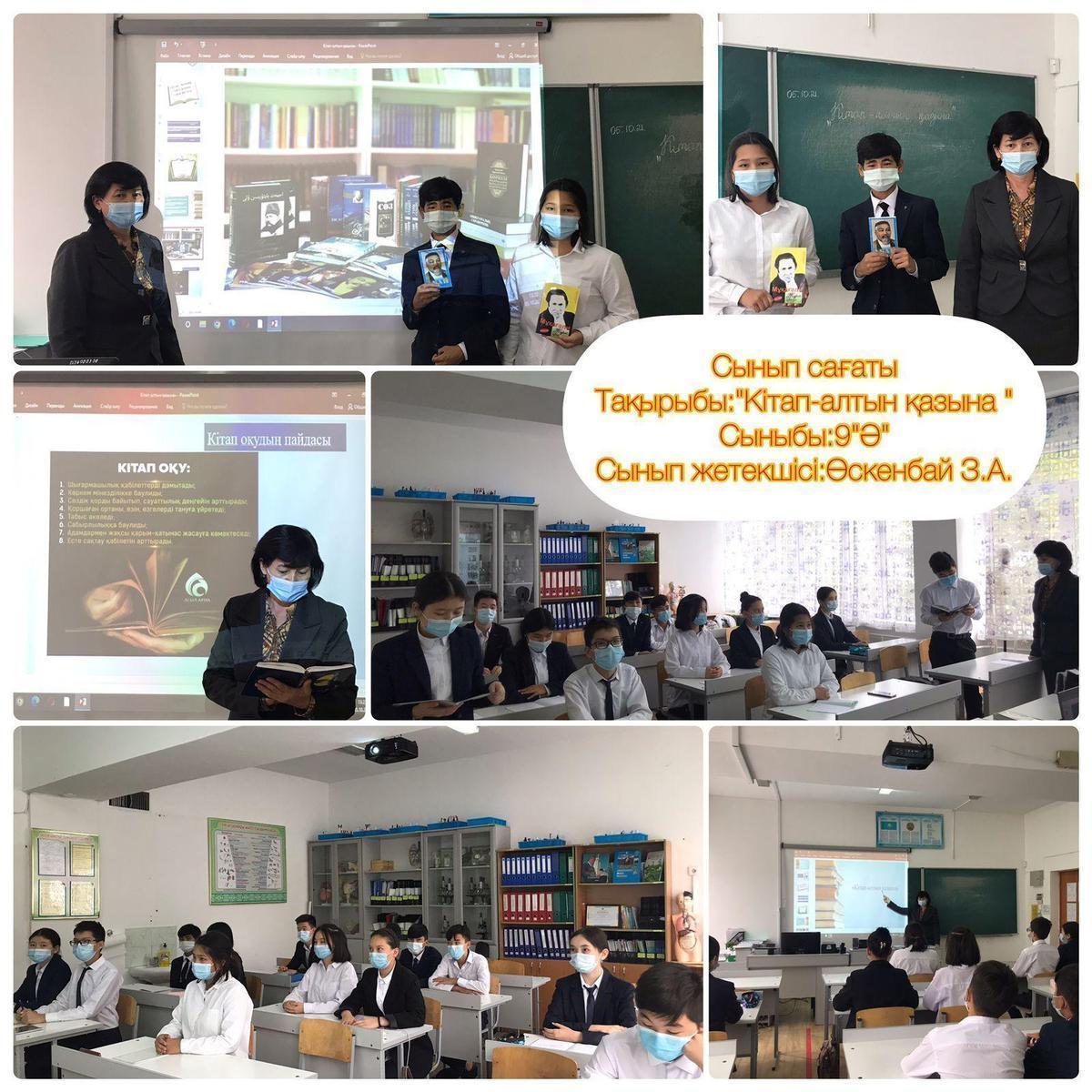05.10.2021 ж күні 1-11 сыныптарға "Кітап-асыл қазына" тақырыбында сынып сағаттары өтілді. Мақсаты: кітаптың адам өміріндегі орны туралы түсінік беру; мәдениетті, парасатты, рухани ойлауы терең, ар - ожданы мол еңбекқор ұрпақты тәрбиелеу, кітапты сүйе білуге, кітапты қадірлеуге баулу.