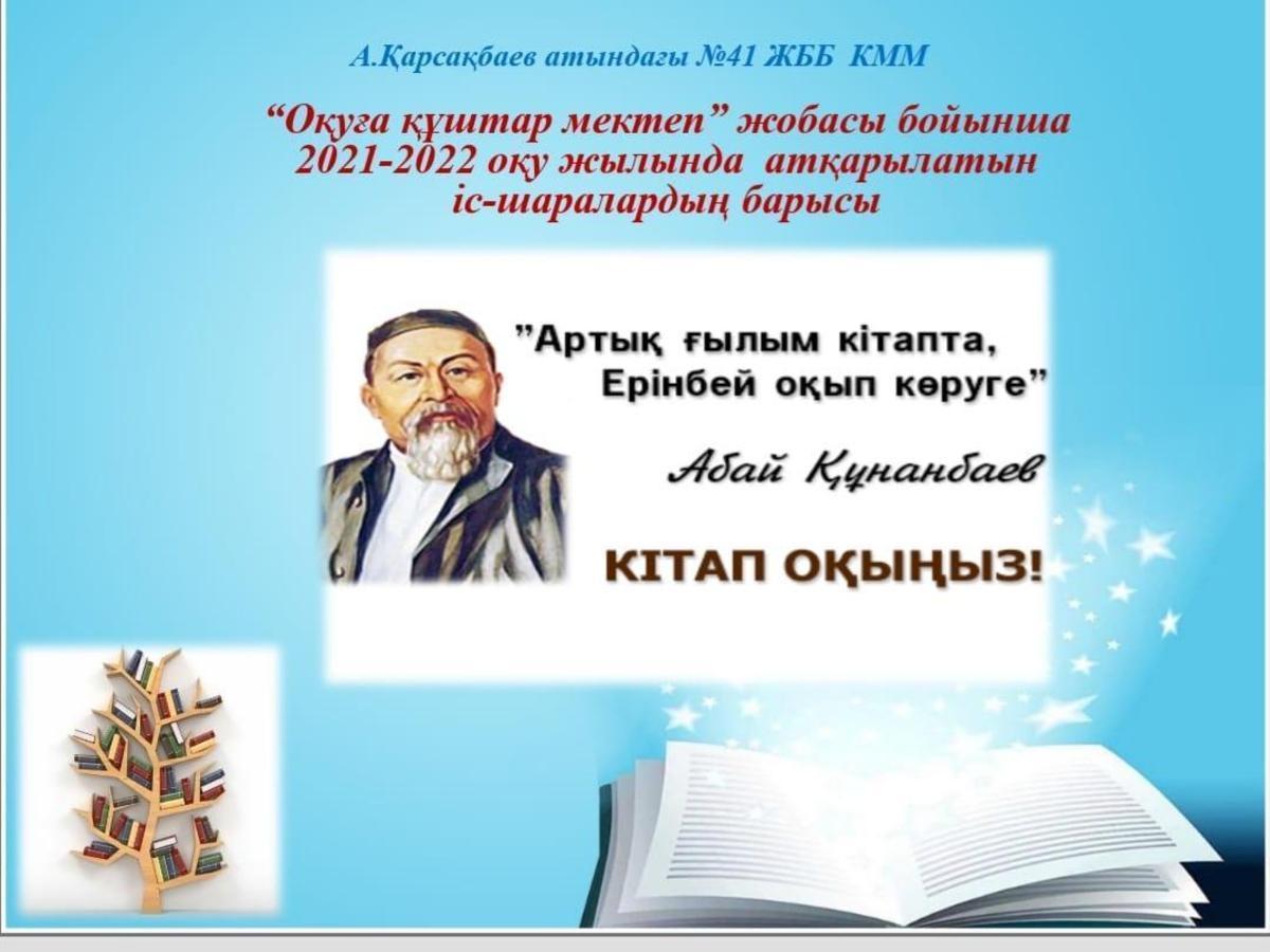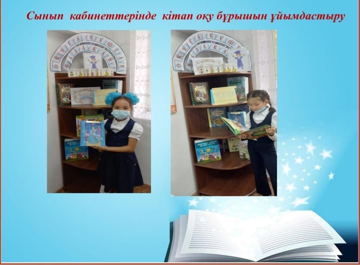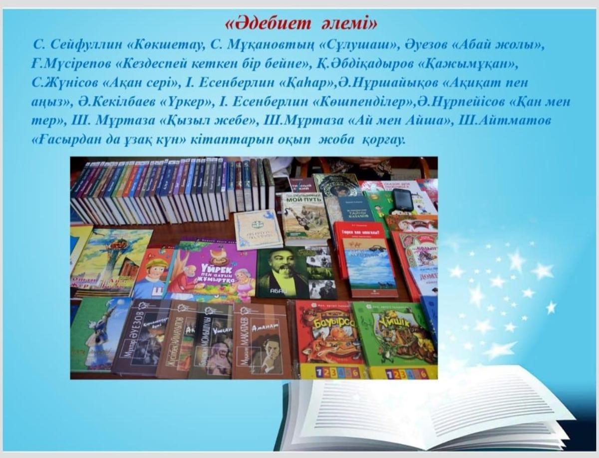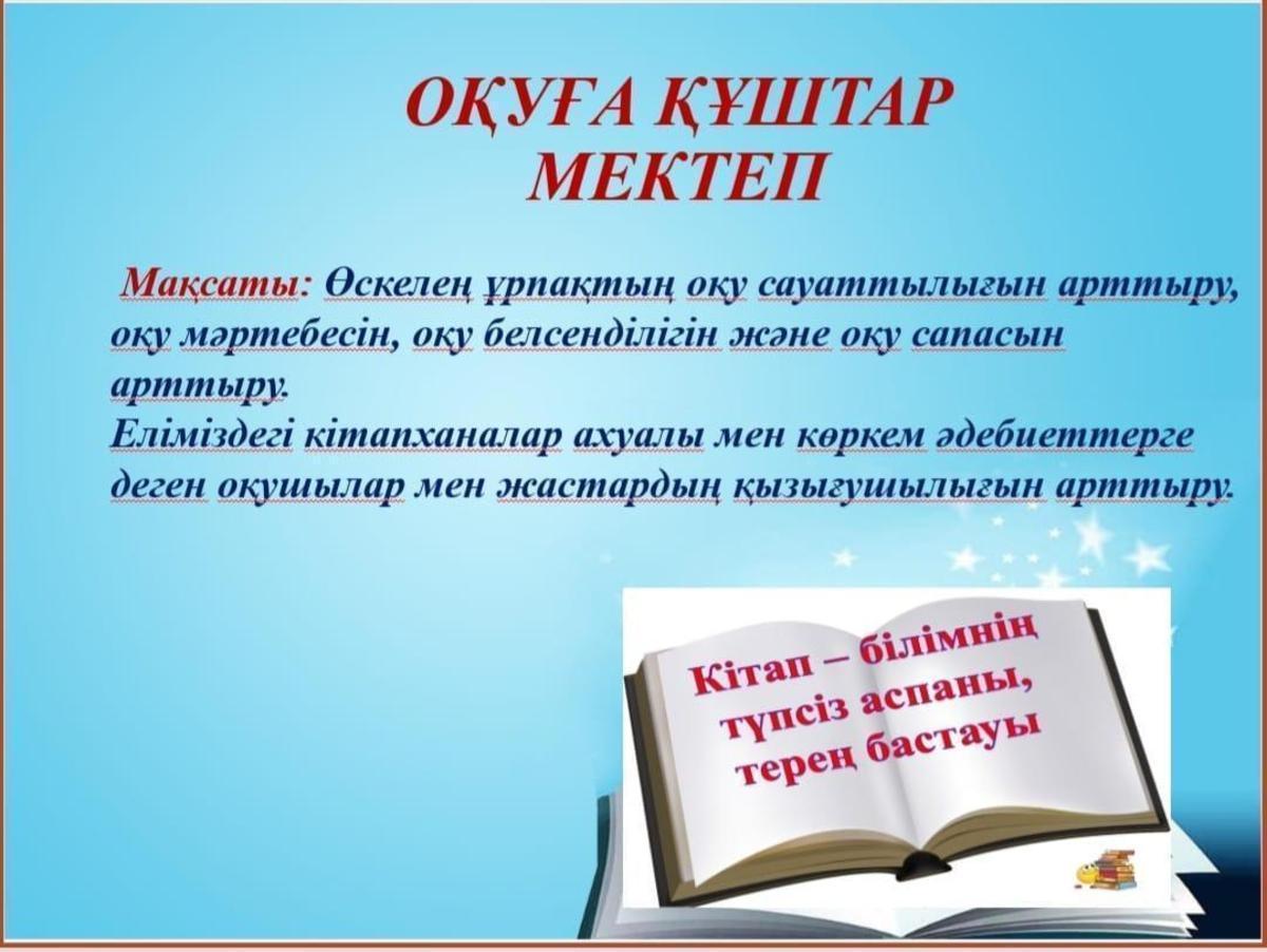 Өскелең ұрпақтың оқу сауаттылығын арттыру, оқу мәртебесін, оқу белсенділігін және оқу сапасын жақсартып, көркем әдебиеттерге деген оқушылар мен жастардың қызығушылығын арттыру мақсатында «Оқуға құштар мектеп» жобасы жүзеге асуда. Осыған орай мектебімізде арнайы жылдық жұмыс жоспары құрылып оқушылардың жас ерекшеліктеріне байланысты кітаптарды оқу ұсынылды.