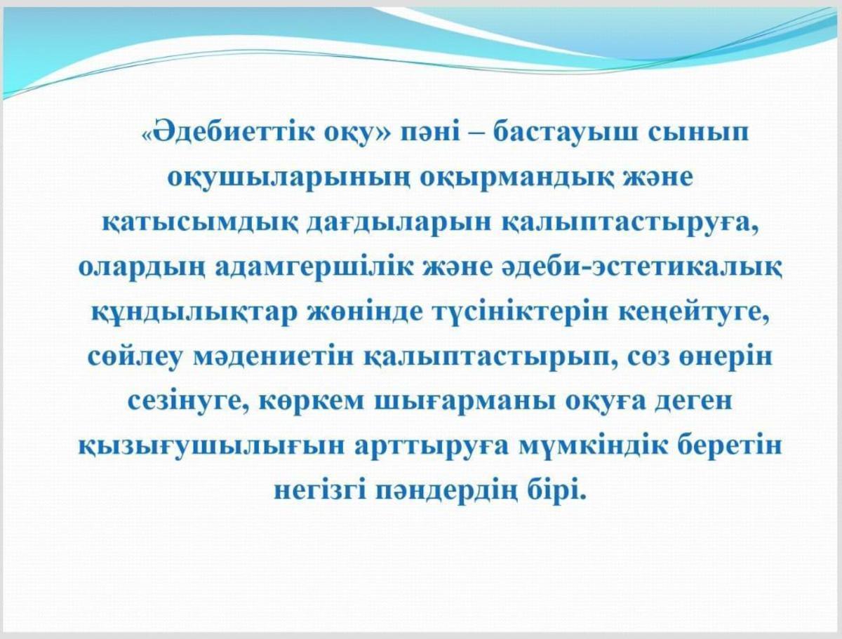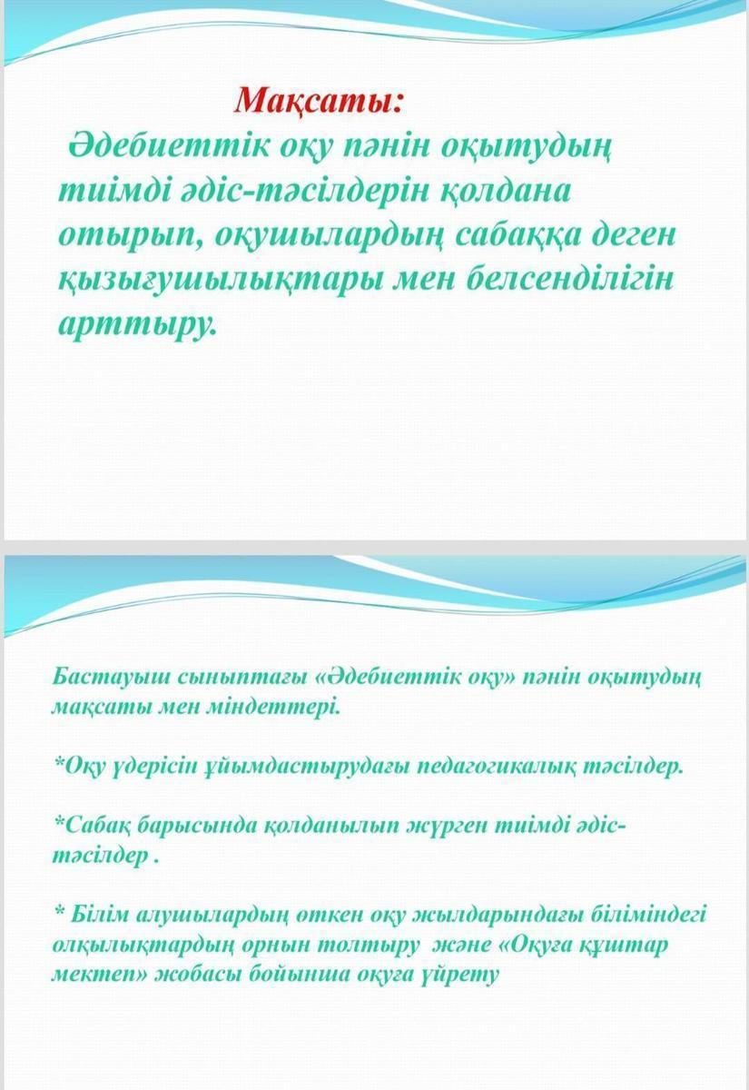 Мақсаты: Әдебиеттік оқу пәнін оқытудың тиімді әдіс-тәсілдерін қолдана отырып, оқушылардың сабаққа деген қызығушылықтары мен белсенділігін арттыру.