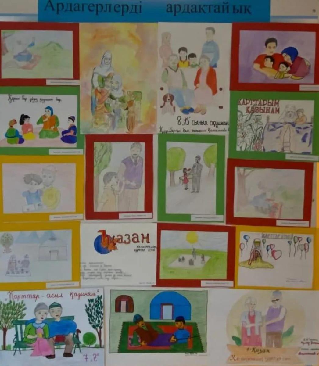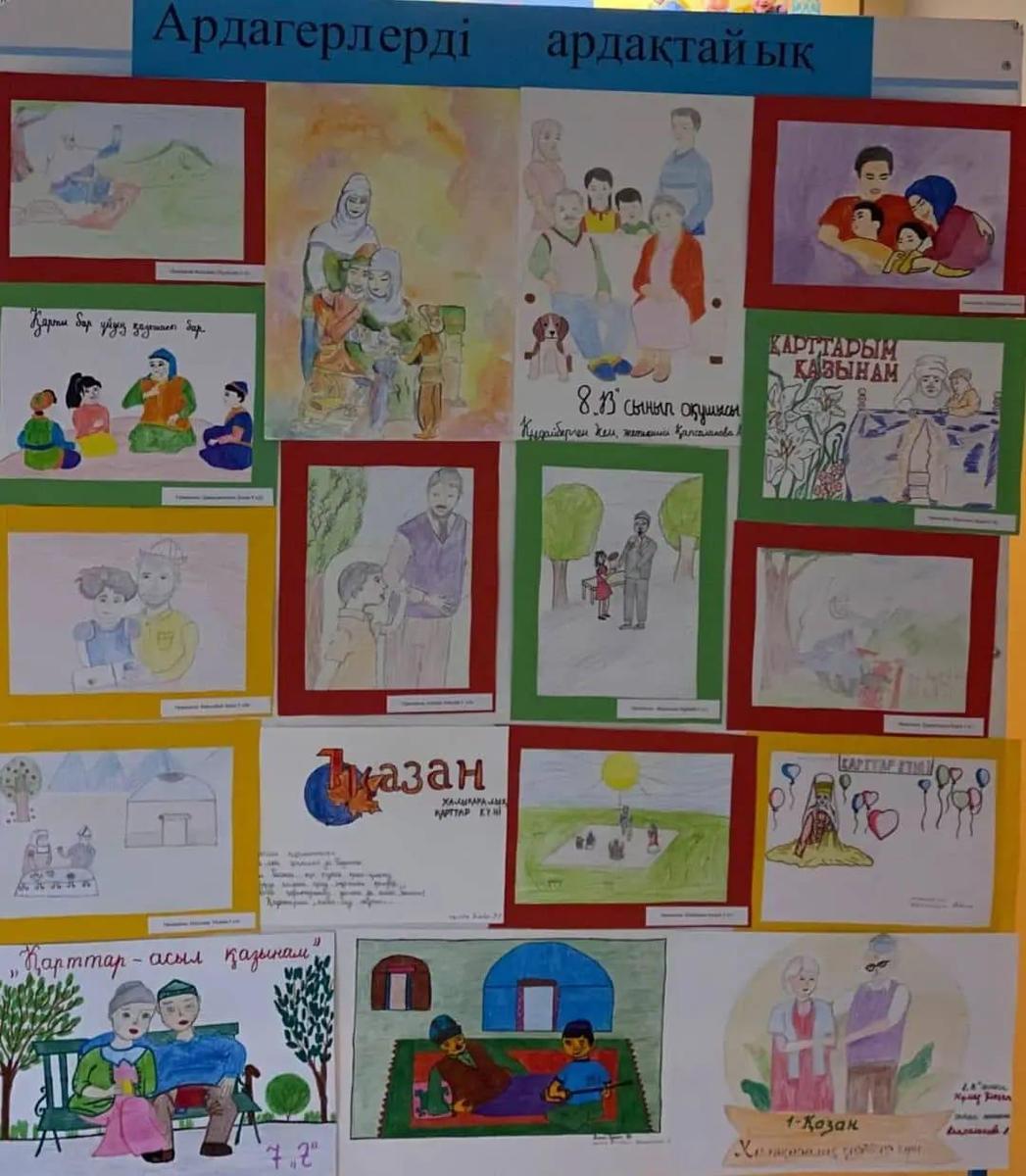 1 қазан – Халықаралық қарттар күні: бізге үлгі болған, тәрбиесін бойымызға сіңірген қарттармызға көңіл бөліп, қамқорлық көрсетуге, қоғамдық көлікте орын беріп, жолдан өте алмай тұрған әжеге көмектесуге, өзіміздің ата-әжемізге хабарласып, хал-жағдайын біліп немесе кез келген жақсы іс істеу үшін ерекше мүмкіндік және де қарттың көңілін білу ешқашан артықтық етпейді. Осыған орай мектебімізде 11.10.2021 ж күні оқушыларымыз сурет көрмесін ұйымдастырды.