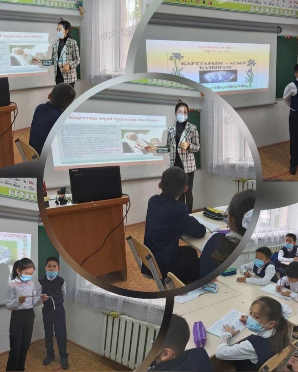 12.10.2021 ж күні А.Қарсақбаев атындағы №41 ЖББМ те 1-11сыныптарға "Мейірімділік пен жақсылық" атты тақырыпта сынып сағаты өтті. Мақсаты: Оқушылардың бойына халқымыздың қадір қасиетін сіңіру, үлкенді сыйлай білуге, өз ата-бабасын ұмытпай есте сақтауға және аталы сөзден ғибрат алуға тәрбиелеу.