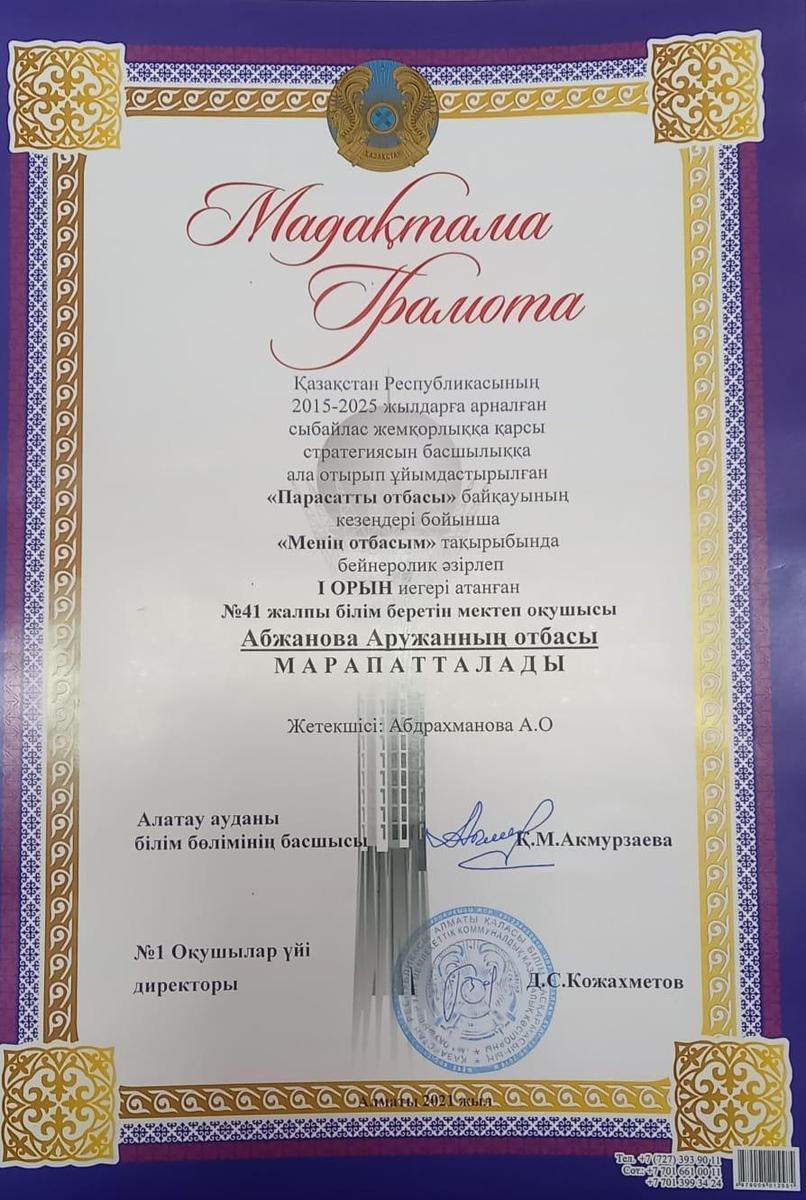 14 қазан 2021 0 1 2 3 4 5 "Парасатты отбасы" байқауының жеңімпазы Қазақстан Республикасының 2015-2025 жылдар арналған сыбайлас жемқорлыққа қарсы стратегиясын басшылыққа ала отырып ұйымдастырылған "Парасатты отбасы" байқауының кезеңдері бойынша "Менің отбасым" тақырыбында бейнеролик әзірлеп І орынмен марапатталды.