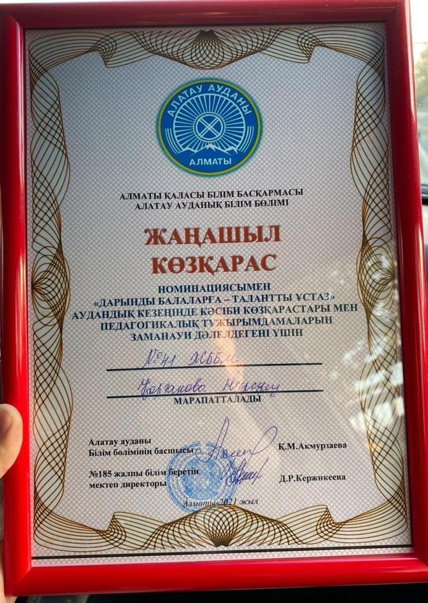 А.Қарсақбаев атындағы №41 ЖББМ 20.10.2021 күні Алатау ауданы бойынша өткізілген "Дарынды балаларға-талантты ұстаз" аудандық іріктеу кезеңіне жас маман- ағылшын пәні мұғалімі Қорғанова Нұрсұлу Төребекқызы қатысып, "Жаңашыл көзқарас" номинациясымен марапатталды.