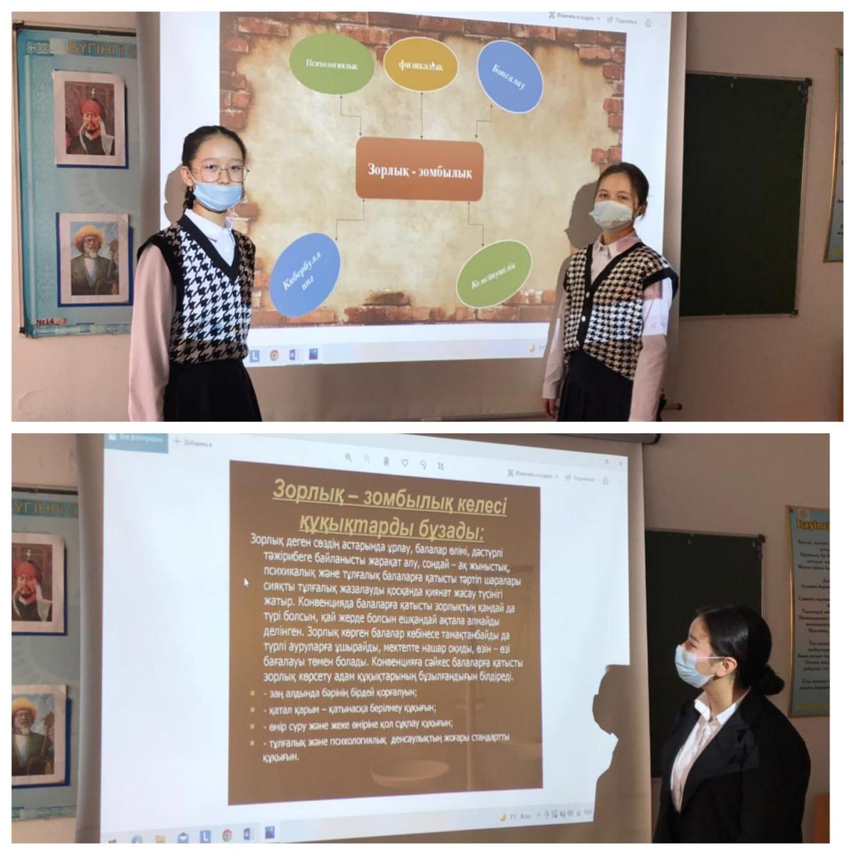 А.Қарсақбаев атындағы №41 ЖББМ «Қатыгездік пен зорлық-зомбылықсыз балалық шақ» ақпараттық науқаны бойынша онкүндік жоспары бойынша жұмыс жүргізілуде.
