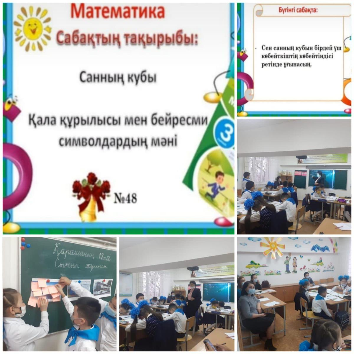 17-қараша күні мектебімізде онкүндік аясында 3 «Д» сыныбында Махатаева Сафура «Санның кубы» тақырыбында ашық сабақ өтті. Сабақтың мақсаты: Санның кубын-бірдей үш көбейткіштің көбейтіндісі ретінде түсіну.Мұғалім сабақта тиімді әдіс-тәсілдерді пайдаланып,жоғары деңгейде өткізді.