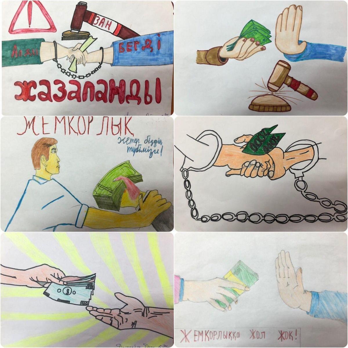 Мақсаты:Қоғамдағы сыбайлас жемқорлық мәселелерін көрсетуге мүмкіндік беру,елдің қоғамдық өміріне қатысуын арттыру.Оқушылардың әлеуметтік мәселелерді шешуге тарту, соның ішінде шығармашылық тұрғыдан дамыту.Сыбайлас жемқорық әрекетінің зардабын көрсету және одан жас ұрпақтың аулақ болуын қамтамасыз ету. Байқау нәтижесі: 1-орын 6”Ж”сынып оқушысы Ахмет Айым, 2-орын 6”Ж” сынып Ахмет Асыл, 7”Ғ”сынып Айтбек Ернар, 3-орын 6”Ж”сынып Дәуренбек Диас, 7”Ғ”сынып Адилжанов Тимур, 6”Г”сынып Жумабек Бота.