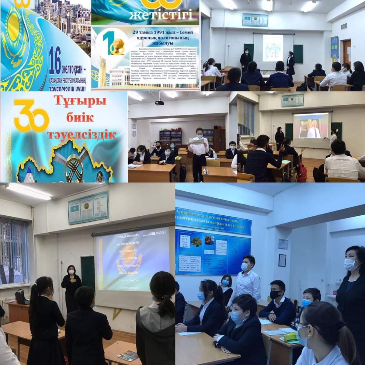 А.Қарсақбаев атындағы №41 жалпы білім беретін мектепте 1-8 сыныптарға «Қазақстанның мәңгілік жері-ұлы дала елі», «Тәуелсіздік - әрбір азаматтың іргелі құндылығы», «Бірлік пен келісім –біздің мемлекеттілігіміздің мызғымас негізі», «Жер-ата-бабаларымыздың баға жетпес мұрасы, халықтың игілігі», «Отбасы және дәстүрлер –қоғамның негізін қалаушы тіректері», «Білімге ұмтылу және еңбекқорлық-әл-ауқаттың кілті», «Прагматизм –бәсекеге қабілеттілік кепілі» тақырыптарында сынып сағаты өтілді. Мемлекет басшысының «Халық бірлігі және жүйелі реформалар – ел өркендеуінің берік негізі» атты Қазақстан халқына Жолдауын жүзеге асыру шеңберінде зайырлы мемлекеттің құндылықтары мен қағидаттарын құрметтеуді қалыптастыру бағытталған «Зайырлы ұрпақ» жобасы аясында 9-11 сыныптар арасында еліміздің тәуелсіздігінің 30 жылдығына арналған «Қазақстан – зайырлы мемлекет» тақырыбында жалпықазақстандық ашық диктант жазды.