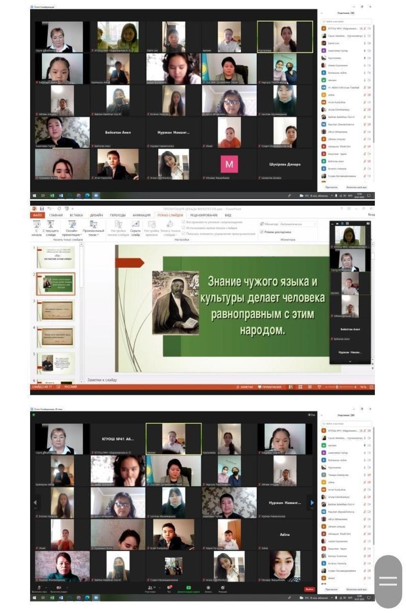 24.01.2022 ж А.Қарсақбаев атындағы №41 жалпы білім беретін мектептің « Тіл – достықтың алтын көпірі» атты орыс тілі мен әдебиеті және ағылшын тілі пәндер бірлестігінің онкүндік ашылу салтанаты онлайн «ZOOM» платформасында өтті.