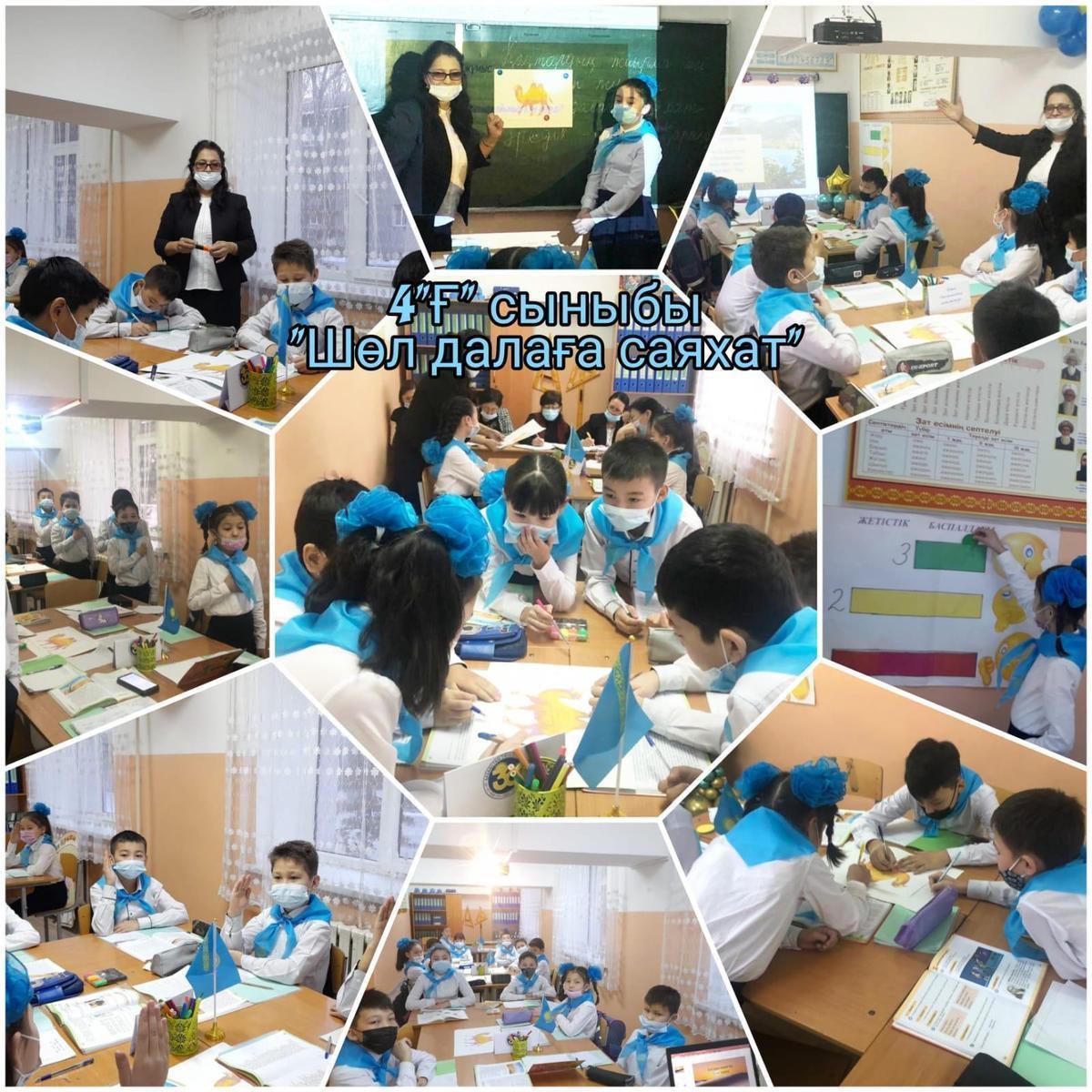 25.01.2022 ж.А.Қарсақбаев атындағы 41 ЖББ мектептің 4 «Ғ»сыныбында әдебиеттік оқу пәнінен « Шөл далаға саяхат» тақырыбында ашық сабақ өтті. Мақсаты:Табиғат құбылыстарымен таныстыру,шөл дала өсімдіктері мен жануарлары туралы мағлұмат беру,мәтіннің мазмұнын ашу.