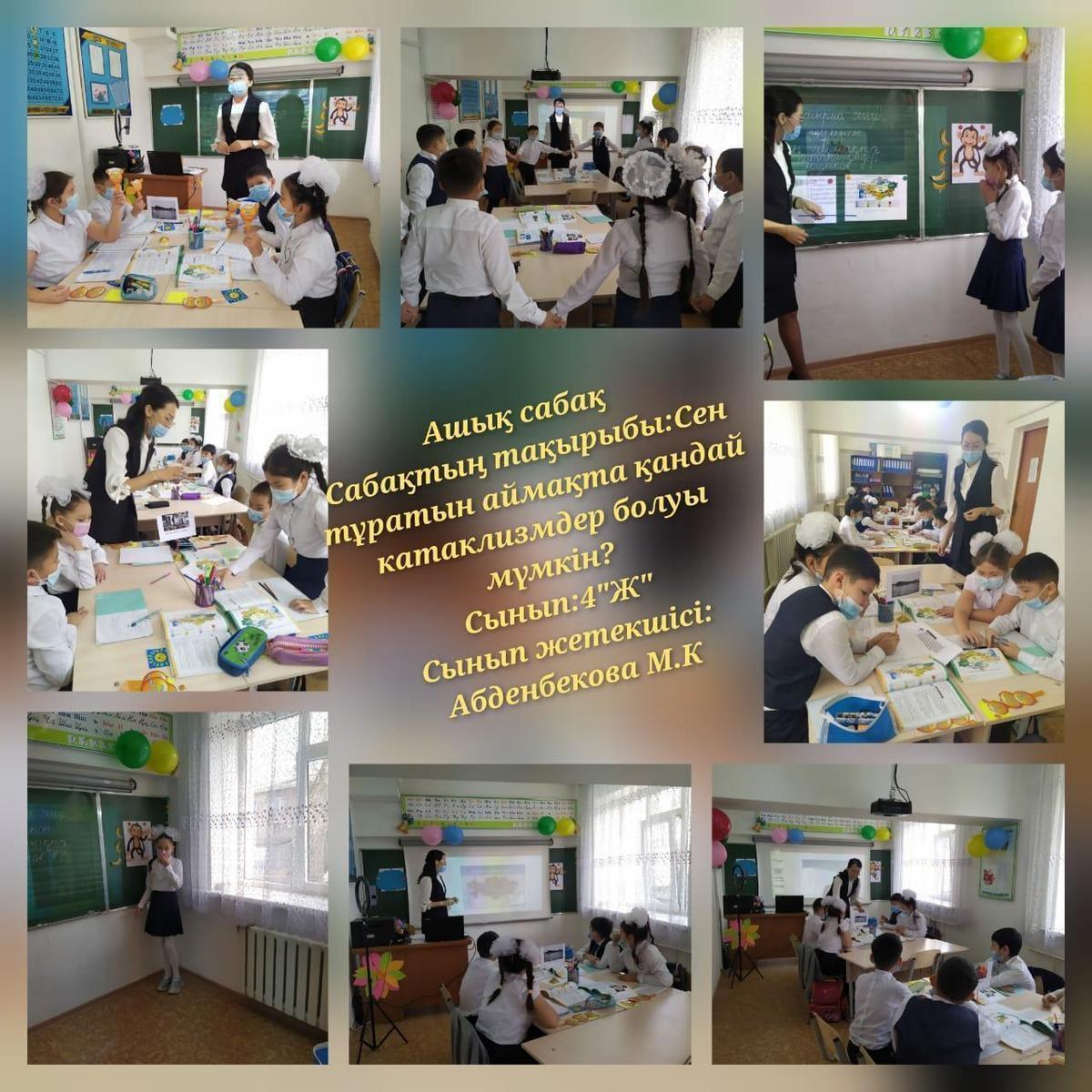А.Қарсақбаев атынбағы 41 ЖББ мектептің 4«Ж» сыныбында Абденбекова Мөлдір дүниетану пәнінен «Сен тұратын аймақта қандай катаклизмдер болуы мүмкін?» деген тақырыпта ашық сабақ өтті. Мақсаты: Зерттеулер негізінде өз өңіріңде туындауы мүмкін табиғи апаттарға болжам жасау.Катаклизм түрлерімен таныстыру.
