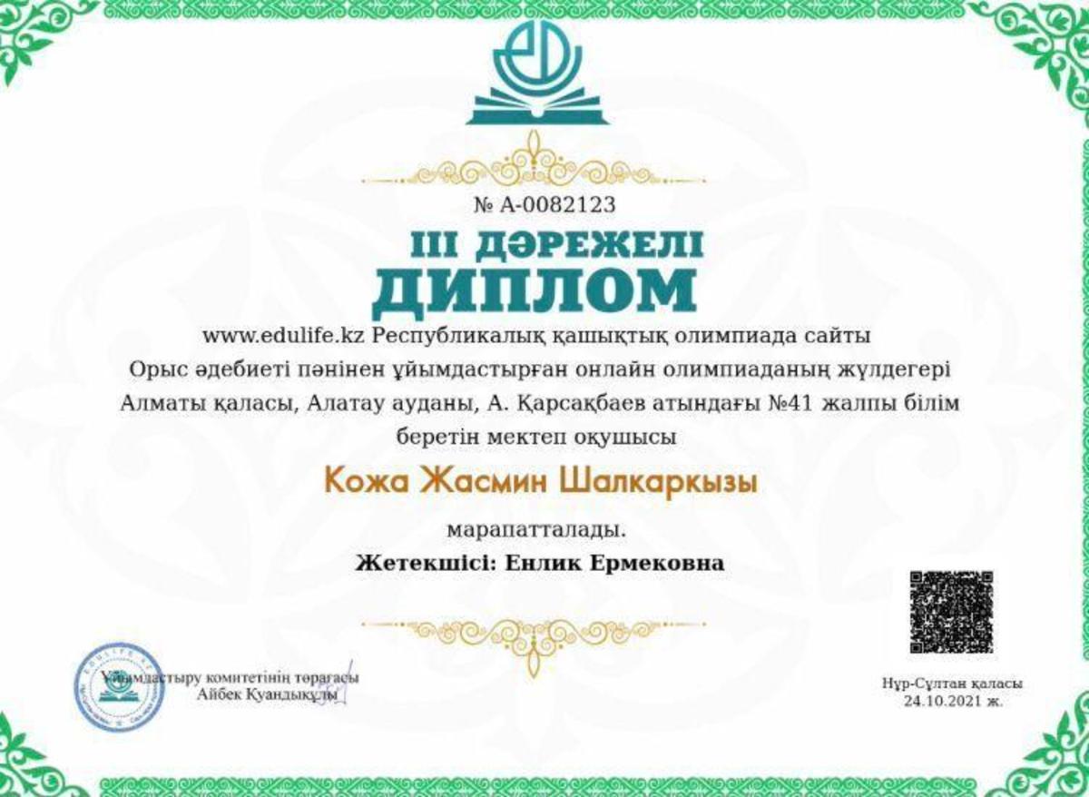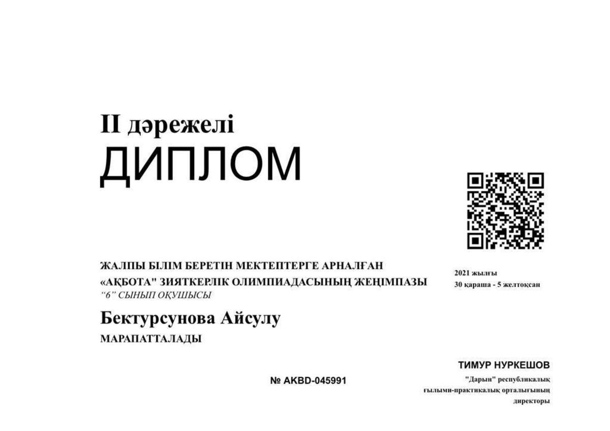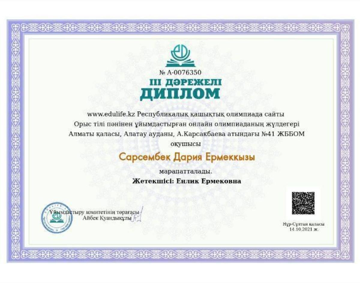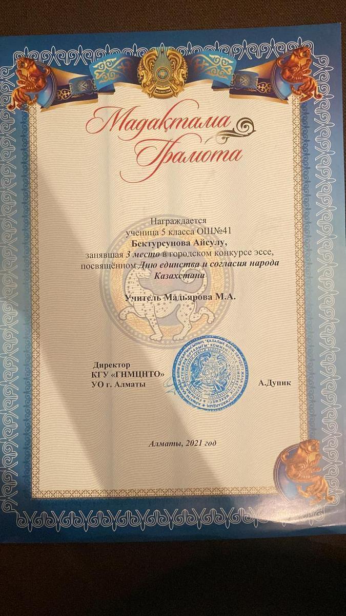 Алматы қаласы Білім басқармасының "Алматы дарын"дарынды балалар мен талантты жастарды анықтау және қолдау жөніндегі орталықтың 2-7 сынып оқушыларына арналған зерттеу жұмыстары мен шығармашылық жобаларының "Зерде" республикалық байқауының қалалық кезеңіне математика- информатика секциясы бойынша "А.Қарсақбаев атындағы № 41 ЖББМ" 6 сынып оқушысы Ишимбаева Альмира қатысып, III - дәрежелі дипломмен марапатталды. Жетекшісі: Кошанова.Ж.Д.