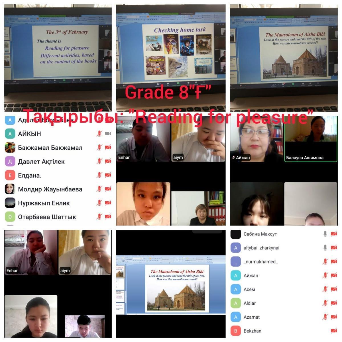 03.02.2022ж. А.Қарсақбаев атындағы №41ЖББМ онкүндік жоспарына сәйкес "Тіл достықтың алтын көпірі" аясында "Reading for pleasure. Different activities based on the content of the books" тақырыбында ағылшын тілі пәні мұғалімі Ашимова Б.С 8"Ғ" сыныбына сабақ өткізді.