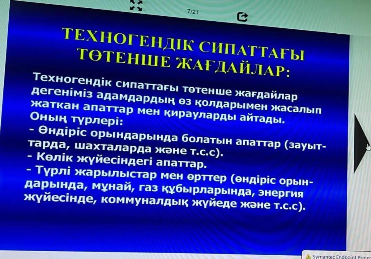 15.02.2022 ж күні "Азаматтық қорғаныс және төтенше жағдайлар"тақырыбында 1-11 сыныптарға оқушыларды жаппай қауіпсіздік шараларымен таныстыру мақсатында түсіндірмелі жұмыстар жүргізілді. Түсіндірмелі жұмыс кезінде түрлі әдіс- тәсілдер қолдана отырып, оқушылардың қауіпсіздік шараларын сақтау сауаттылықтарын артыру мақсаты жолға қойылды. Оқушылардың күнделікті тіршілігімен байланыстыра өткізіліп, өз ойларымен бөлісті.
