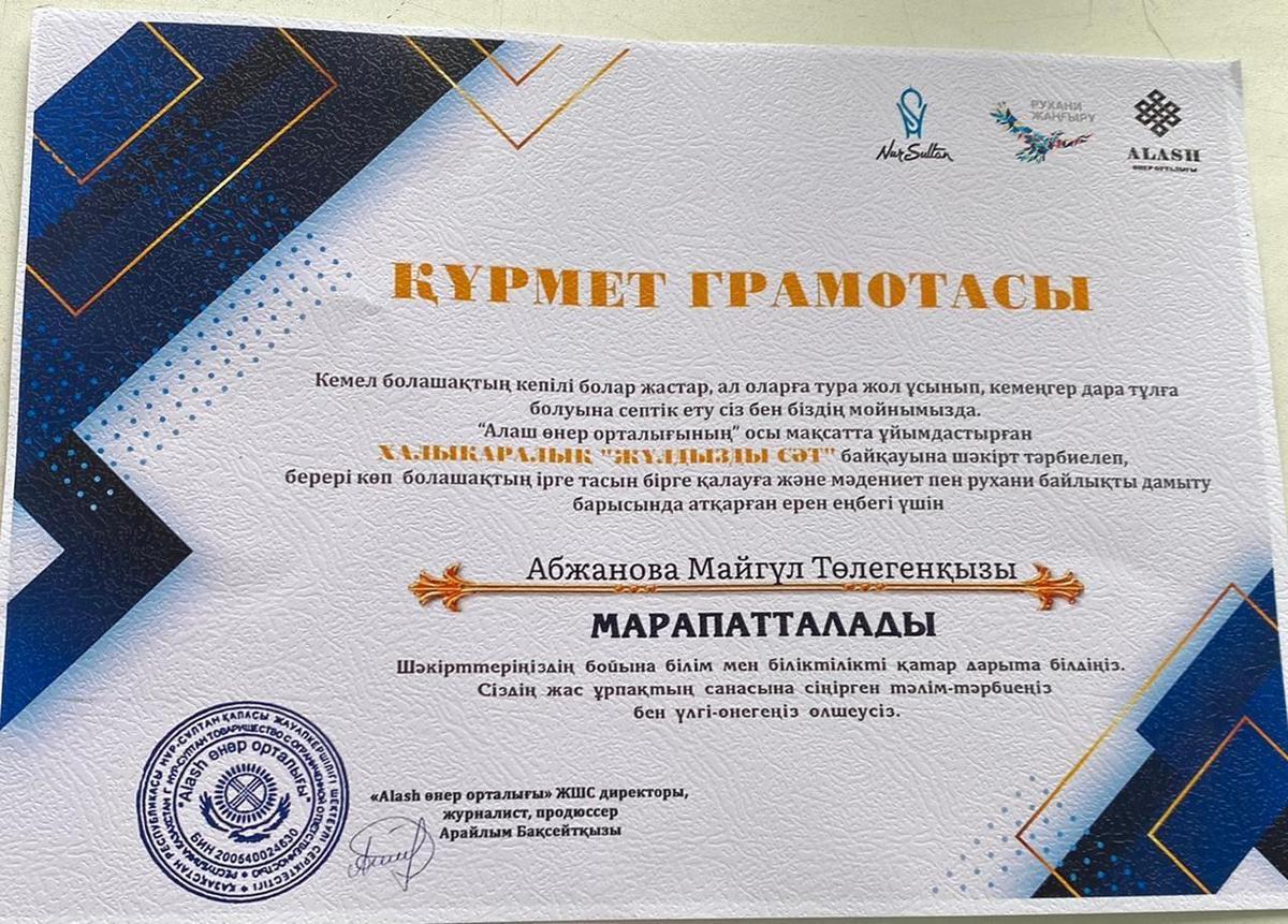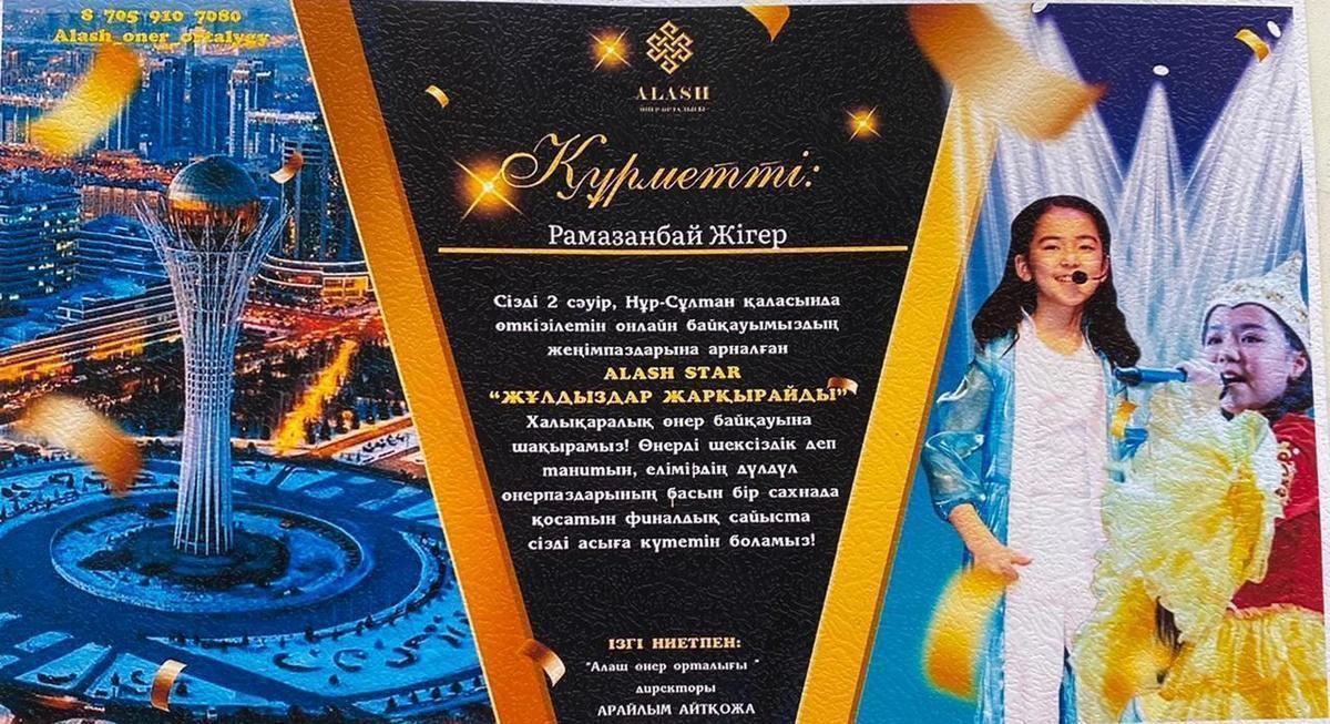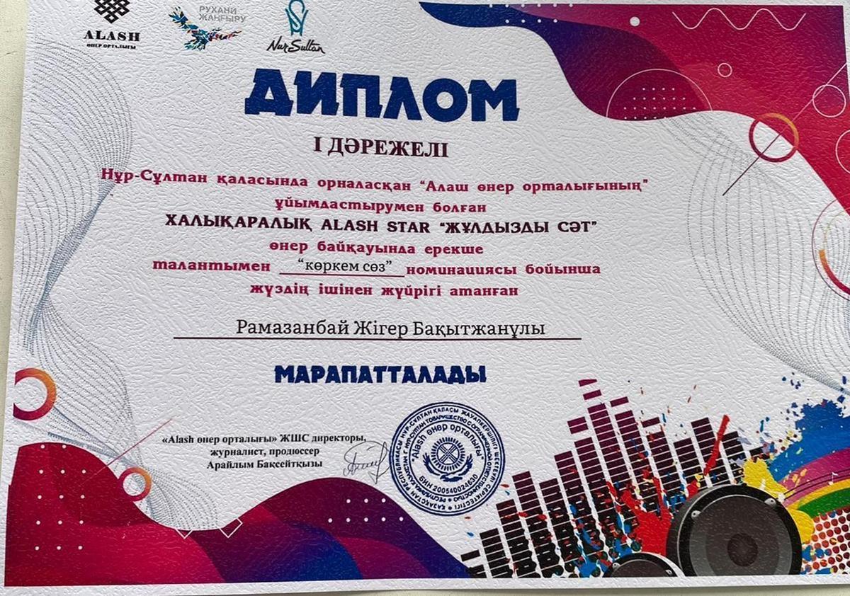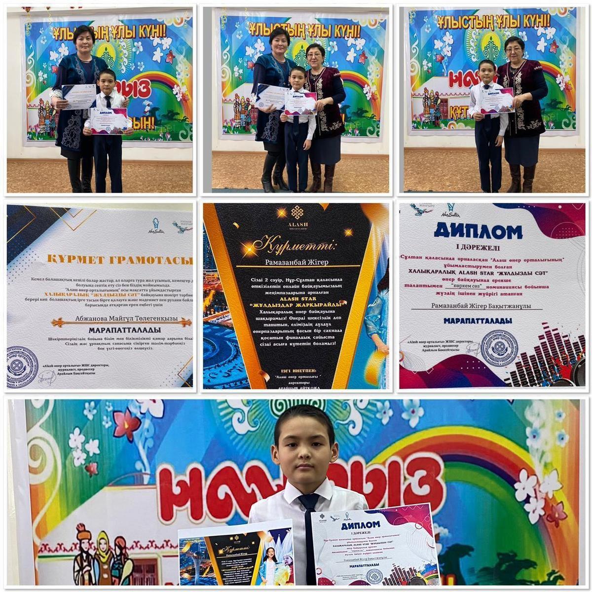 А.Қарсақбаев атындағы 41 ЖББ мектептің 3 “ Ғ “ сынып оқушысы Рамазанбай Жігер Бақытжанұлы Алаш өнер орталығы ұйымдастырған Халықаралық “Жұлдызды сәт” өнер байқауына қатысып, ерекше талантымен көзге түсіп,“Көркем сөз “ номинациясын жеңіп алды.Сынып жетекшісі Абжанова Майгүл. Жігер 2-сәуірде Нұр-Сұлтан қаласында өтетін халықаралық “ Жұлдыздар жарқырайды” атты онлайн өнер байқауына жолдама алды.