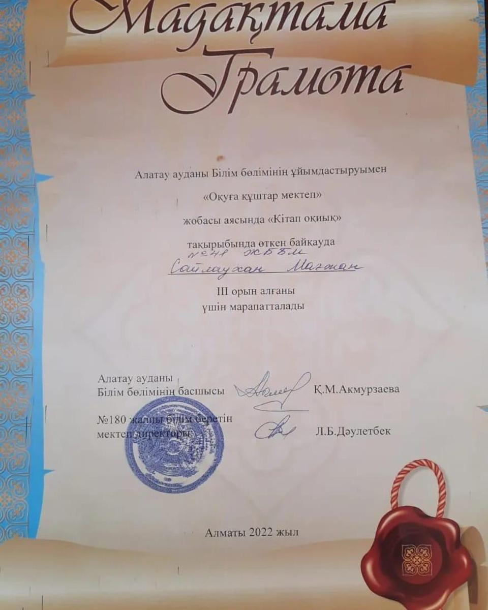 Алатау ауданы Білім бөлімінің ұйымдастыруымен өткізілген "Оқуға құштар" жобасы аясында өткізілген "Кітап оқиық" тақырыбында өткен байқаудың ІІІ орын жеңімпазы Сайлаухан Мағжан марапатталды. Жарайсың, Мағжан! Тек алға!