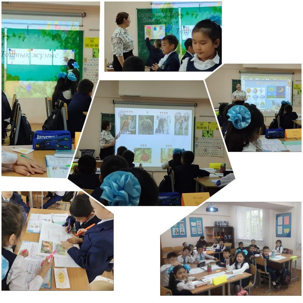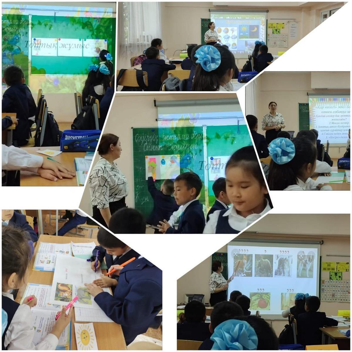 Ребус шешу арқылы жаңа сабақтың тақырыбын ашты.Оқушыларға топтық тапсырмалар орындатып, кітаппен, дәптермен,тақтамен жұмыстарды жасатты.Сабақ барысында "Қар кесегі","Ауа райы" әдістерін тиімді қолданды.