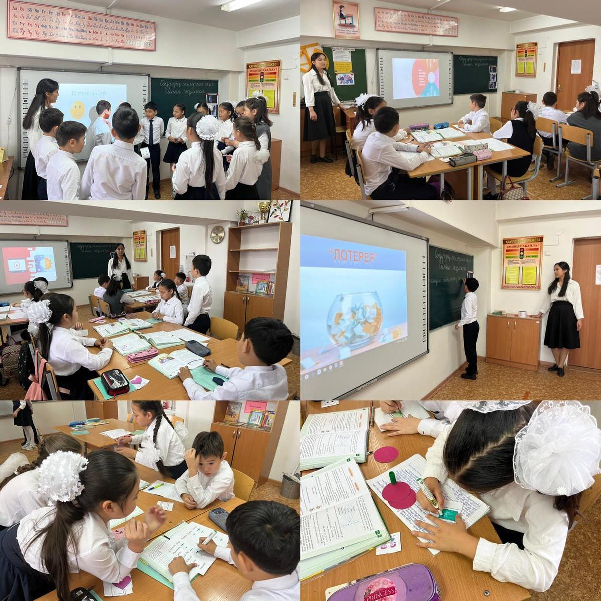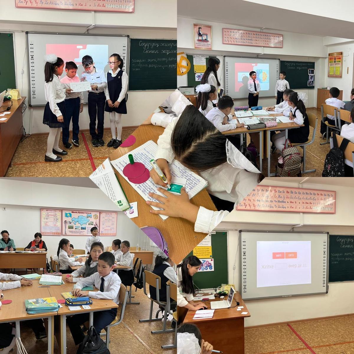 Мұғалім сабақты "Шаттық шеңбері" арқылы психологиялық ахуал қалыптастырумен бастады. Оқушыларға топтық тапсырмалар орындатып, кітаппен, дәптермен, тақтамен жұмыстарды жасатты. Сабақ барысында "Кім тапқыр" ойыны ойнатылды. "Сәттілік шеңбері" , “Лотерея”, “Жаңылмай айтайық” әдістерін, “Есте сақтау” диктантын тиімді қолданды.
