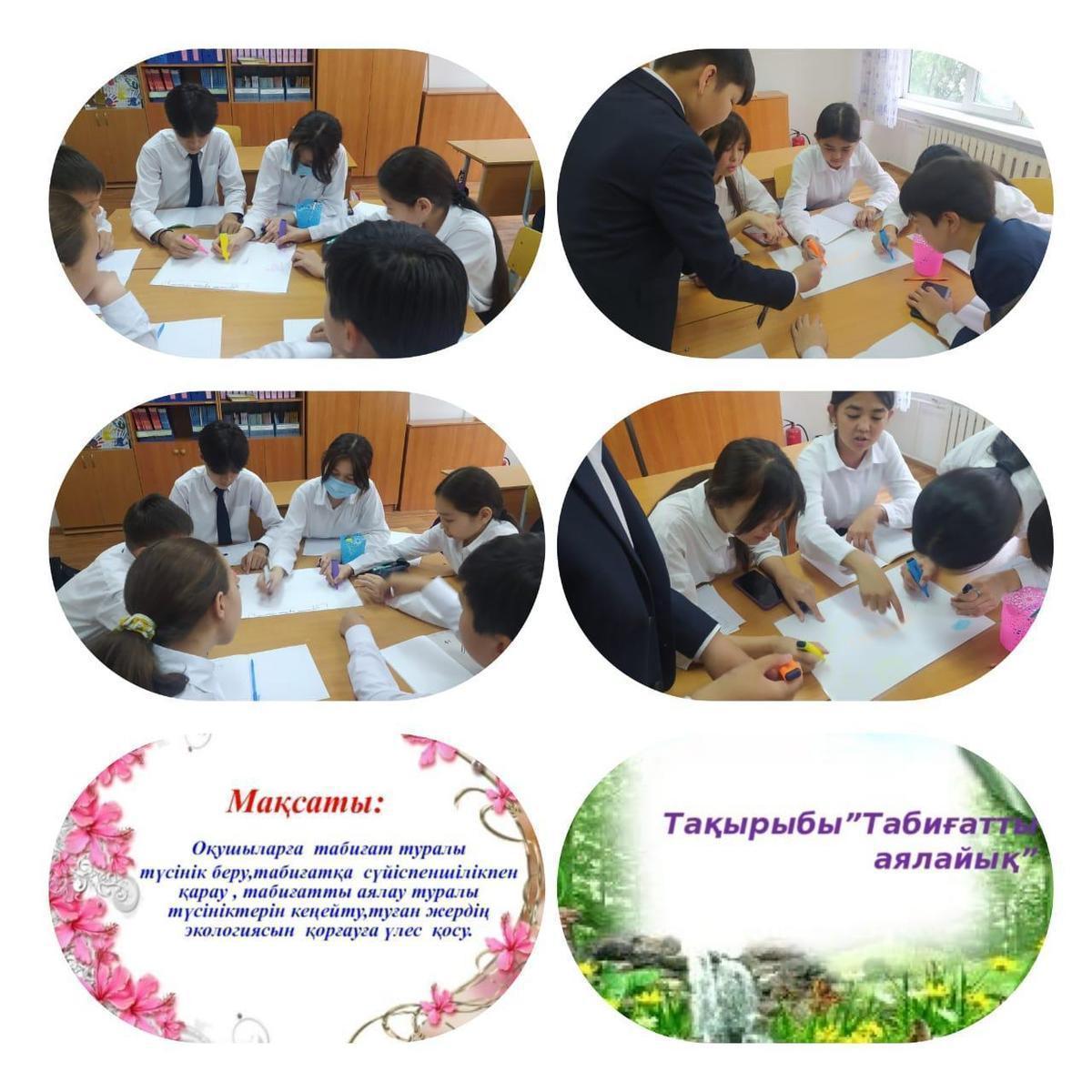А. Қарсақбаев атындағы №41 ЖББ мектепте 7 "г" сыныбында "Табиғатты аялайық" атты тәрбие сағаты өтті. Мақсаты: Оқушыларға табиғат туралы түсінік беру, табиғатқа сүйіспеншілікпен қарау, табиғатты аялау туралы түсініктерін кеңейту,туған жердің экологиясын қорғауға үлес қосу.
