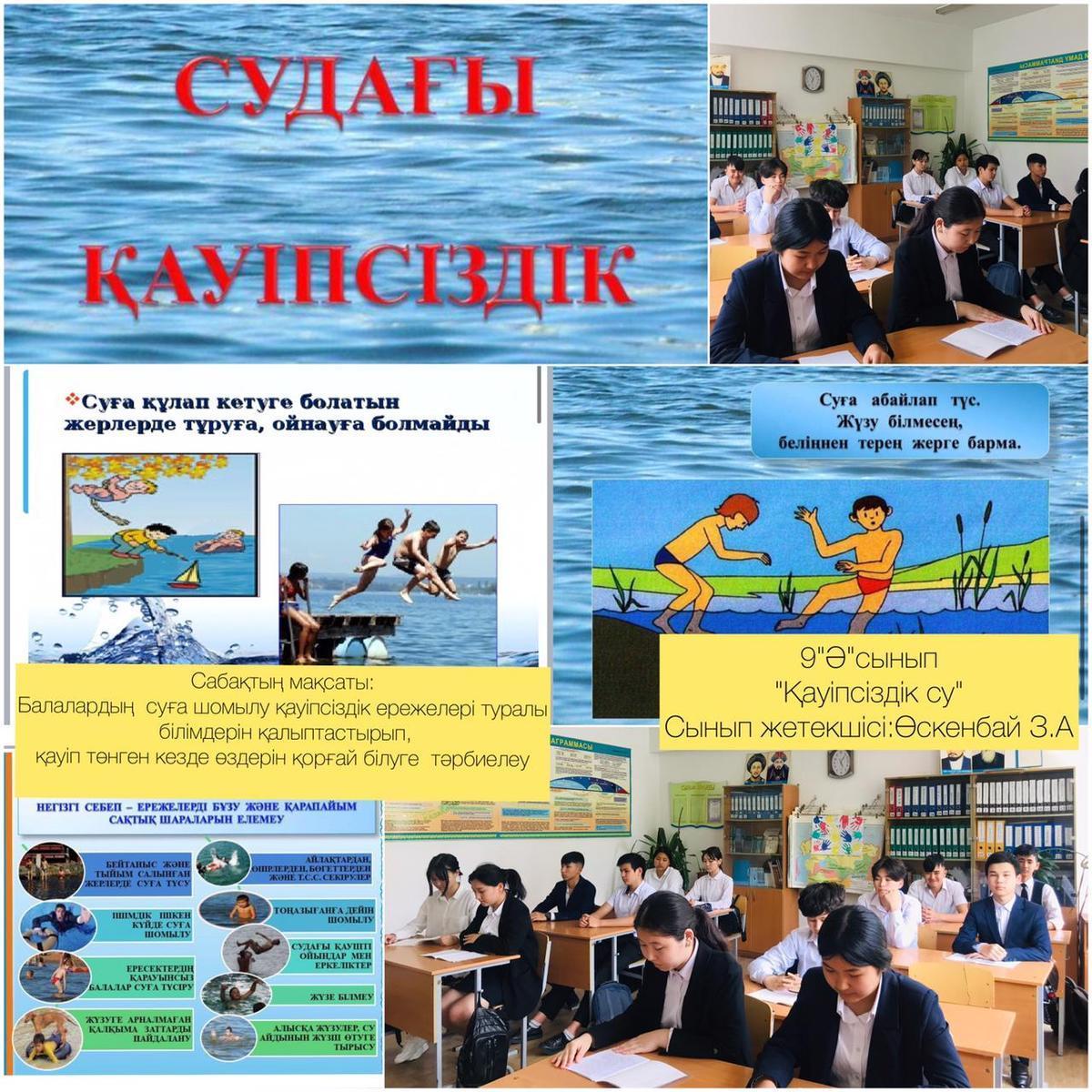 А.Қарсақбаев атындағы №41ЖББМ 9"А", "Ә", "Ғ", сыныптарында "Қауіпсіз су" тақырыбында сынып сағаттары өтті. Мақсаты: Балалардың суға шомылу қауіпсіздік ережелері туралы білімдерін кеңейтіп және түсініктерін қалыптастырып, қауіп төнген кезде өздерін қорғай білуге машықтандыру.