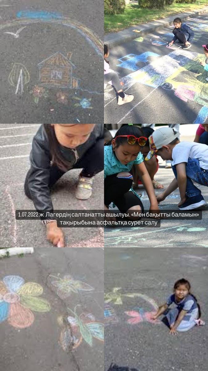 А.Қарсақбаев атындағы №41 ЖББ мектептің жанындағы ұйымдастырылған «Ақ көгершін» жазғы демалыс лагерінде 1 шілде күні жоспарға сәйкес жазғы лагерлің салтанатты ашылуына «Мен бақытты баламын» тақырыбына асфальқа сурет салу іс-шарасы өтті.
