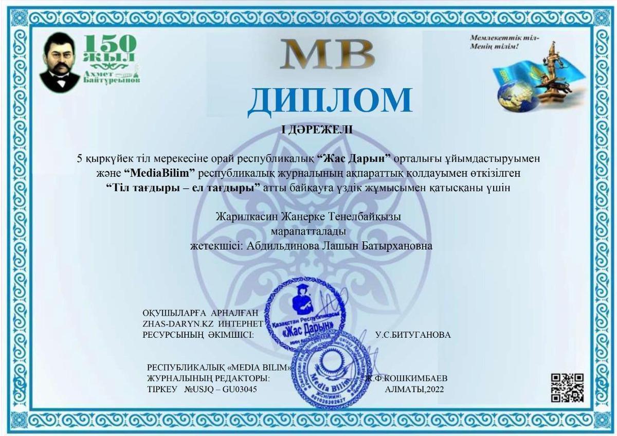 21 қыркүйек 2022 0 1 2 3 4 5 "Тіл тағдыры-ел тағдыры" байқауына қатысып, дипломмен марапатталған шәкірттеріміз. Жарайсыңдар!