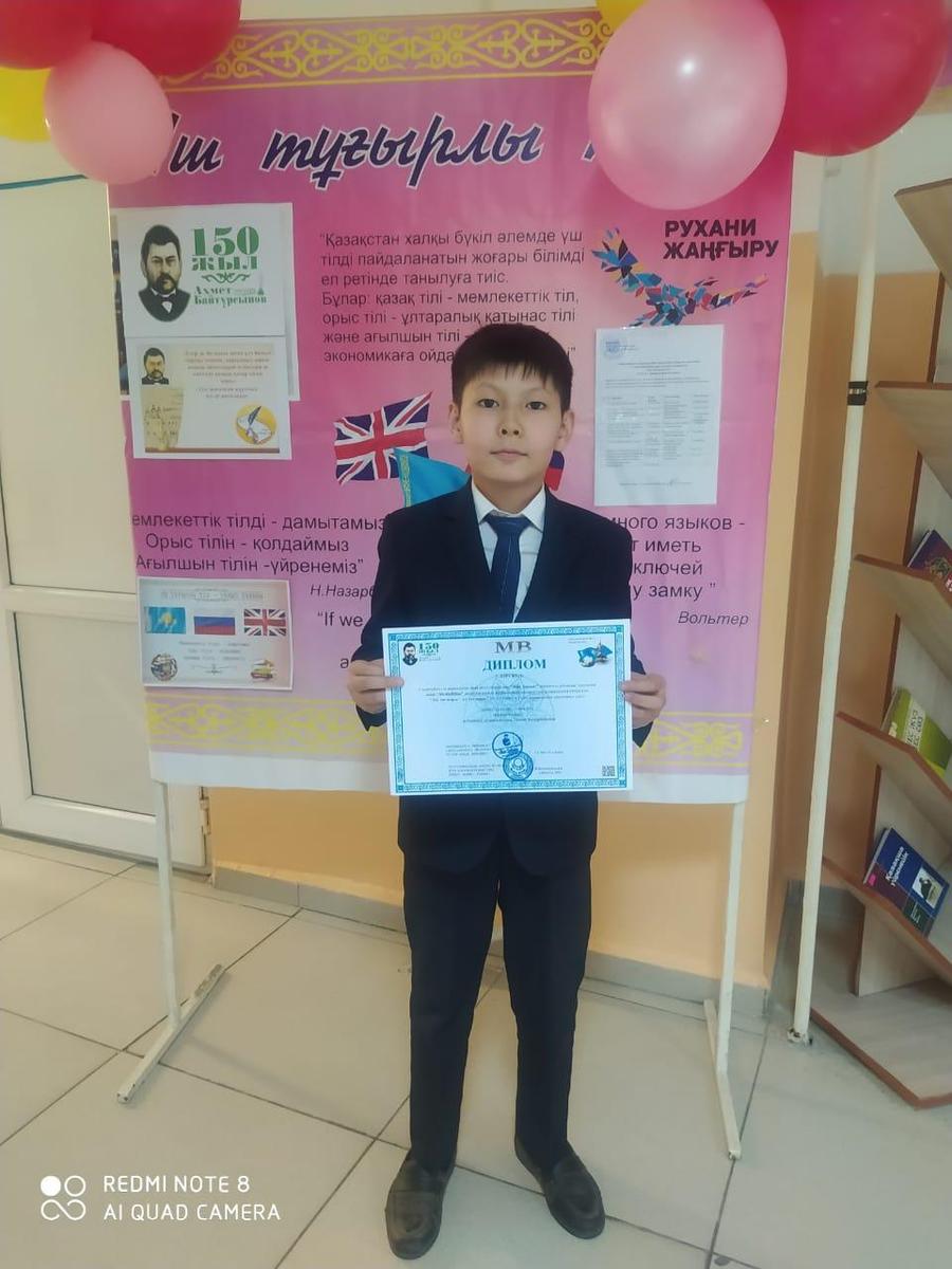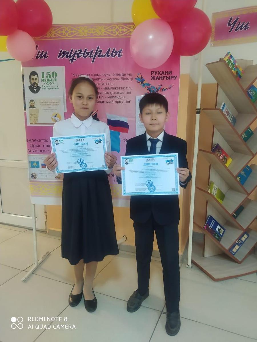 2022 жылдың 5-қыркүйегінде тіл мерекесіне орай республикалық "Жас Дарын" орталығының және "MediaBilim" республикалық журналының ақпараттық қолдауымен өткізілген "Тіл тағдыры - ел тағдыры" атты байқауға үздік жұмысымен қатысқан 5 "Е" сынып оқушылары І дәрежелі дипломмен марапатталды.