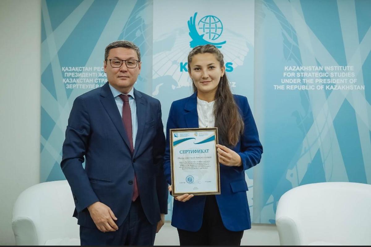 Қазақстан Республикасының Президенті жанындағы стратегиялық зерттеу институтының ұйымдастыруымен өткен "Қазақстанның болашақ келбеті" жас сарапшыларды қолдау бағдарламасының 2-ші кезеңінің нәтижесінде Алматы қаласы, Алатау ауданы "А.Қарсақбаев атындағы №41 жалпы білім беретін мектебінің" тарих пәні мұғалімі, магистр Абдильдинова Лашын Батырхановна зерттеу орталығының директоры Еркін Тұқымовтың арнайы сертификатымен маратталды.