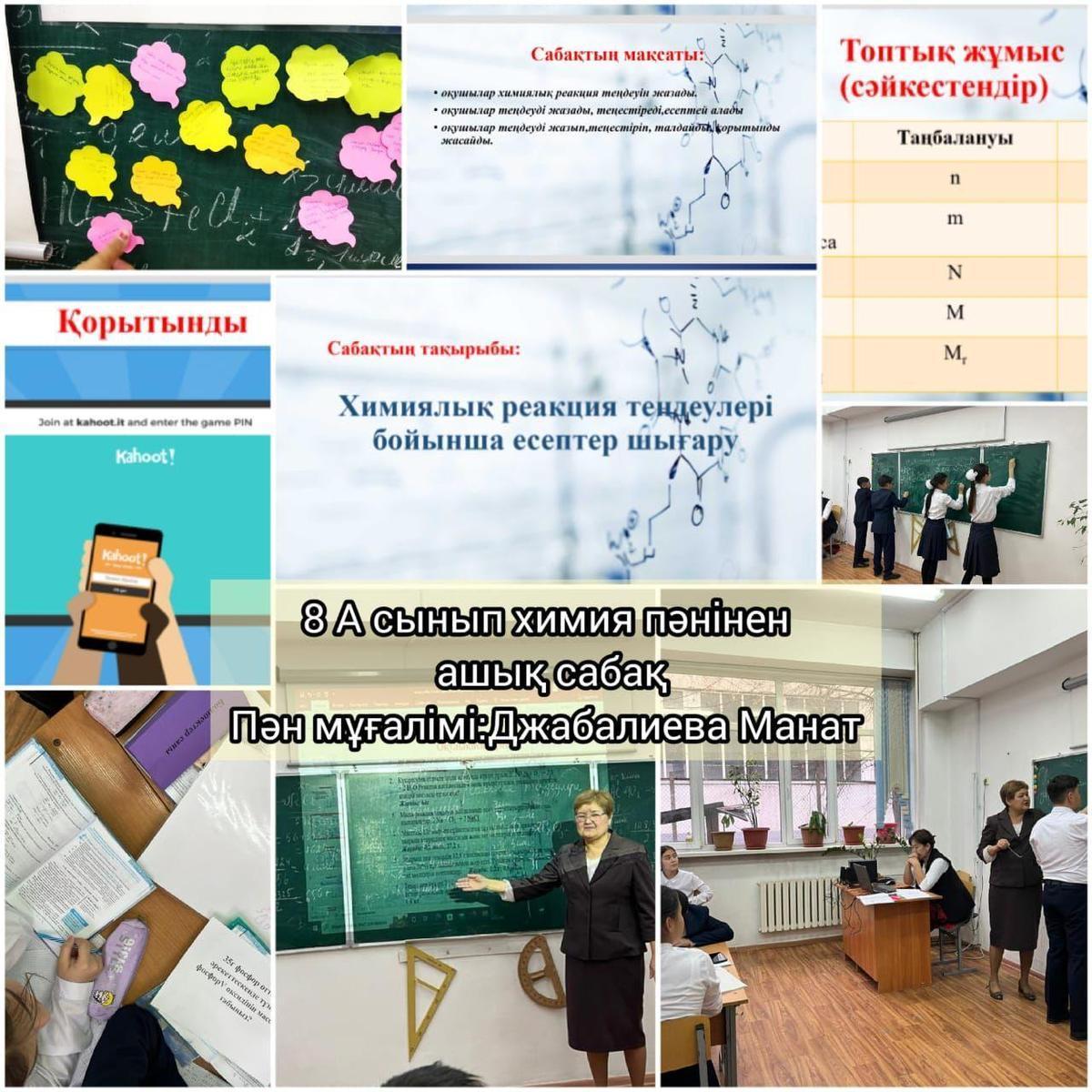 А. Қарсақбаев атындағы №41 жалпы білім беретін мектебінде “Табиғат адамзаттың өмірінің нәрі, қажеттінің табылар содан бәрі” атты апталықтың аясында химия пәні мұғалімі Джабалиева Манат Ахановна 8"А" сынып оқушыларына, химия пәнінен "Химиялық реакция теңдеулері бойынша есептер шығару" тақырыбында ашық сабақ өтті.