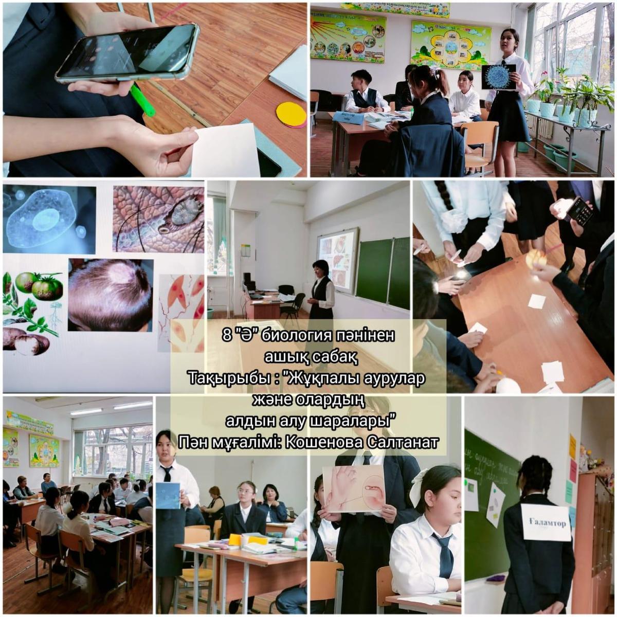 А. Қарсақбаев атындағы № 41 жалпы білім беретін мектебінде “Табиғат адамзаттың өмірінің нәрі, қажеттінің табылар содан бәрі” атты апталықтың аясында биология пәні мұғалімі Кошенова Салтанат Сайдрахмановна 8"Ә" сынып оқушыларына, биология пәнінен "Жұқпалы аурлар және олардың алдын алу шаралары " тақырыбында ашық сабақ өтті.