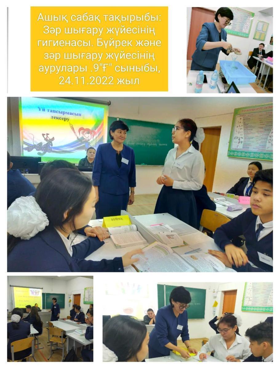 Мұғалім сабақты Тақырыпқа байланысты суреттер мен сөздер жазылған «Қима қағаздар» арқылы топқа біріктіріп, сұрақтарға жауап беру арқылы өткен сабақты сұрап,жаңа сабақты «Миға шабуыл» әдісі арқылы бастады. «Бүйрек және зәр шығару жүйесінің аурулары» жайлы бейнематериал көрсетілді Сабақ барысында: оқушылар топтық жұмысты «Кластер» әдісі бойынша және жеке, жұптық жұмыстар орындады. Сабақтың «Сергіту» сәтінде ширату жаттығулары жасалды . «Wordwall” платформасы арқылы «Шындық –жалған» тапсырмалары беріліп орындалды.Сабақтың бекіту сәті «Kahoot» платформасы арқылы тест тапсырмаларымен бекітілді. «3Қ» әдісі кері байланыс жасалды. Сабақ соңында үйге тапсырма «Бөліп шығару мүшелерінің қызметін сақтау» туралы эссе жазу беріліп, оқушылар 10 балдық жүйемен бағаланды.
