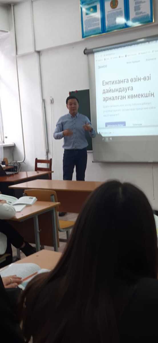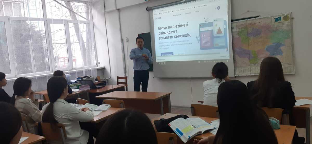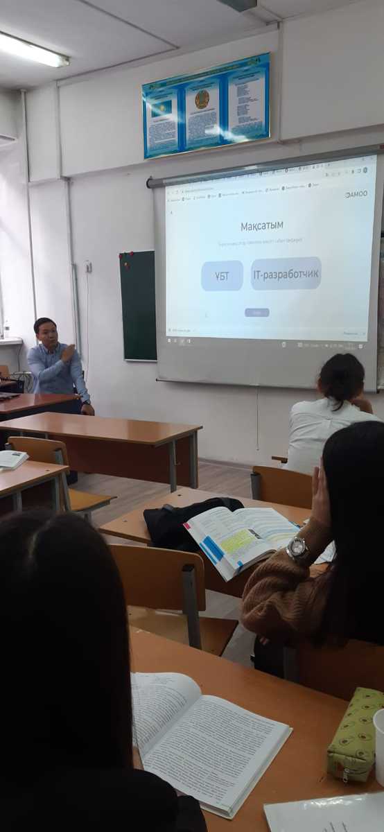 11-сынып түлектеріне Алматы қаласы DAMOO.kz орталығының менеджері Нұрсұлтан Есілбаев Мұхамедиярұлы Ұлттық Бірыңғай Тестілеуге дайындық туралы біраз ақпараттармен таныстырып өтт