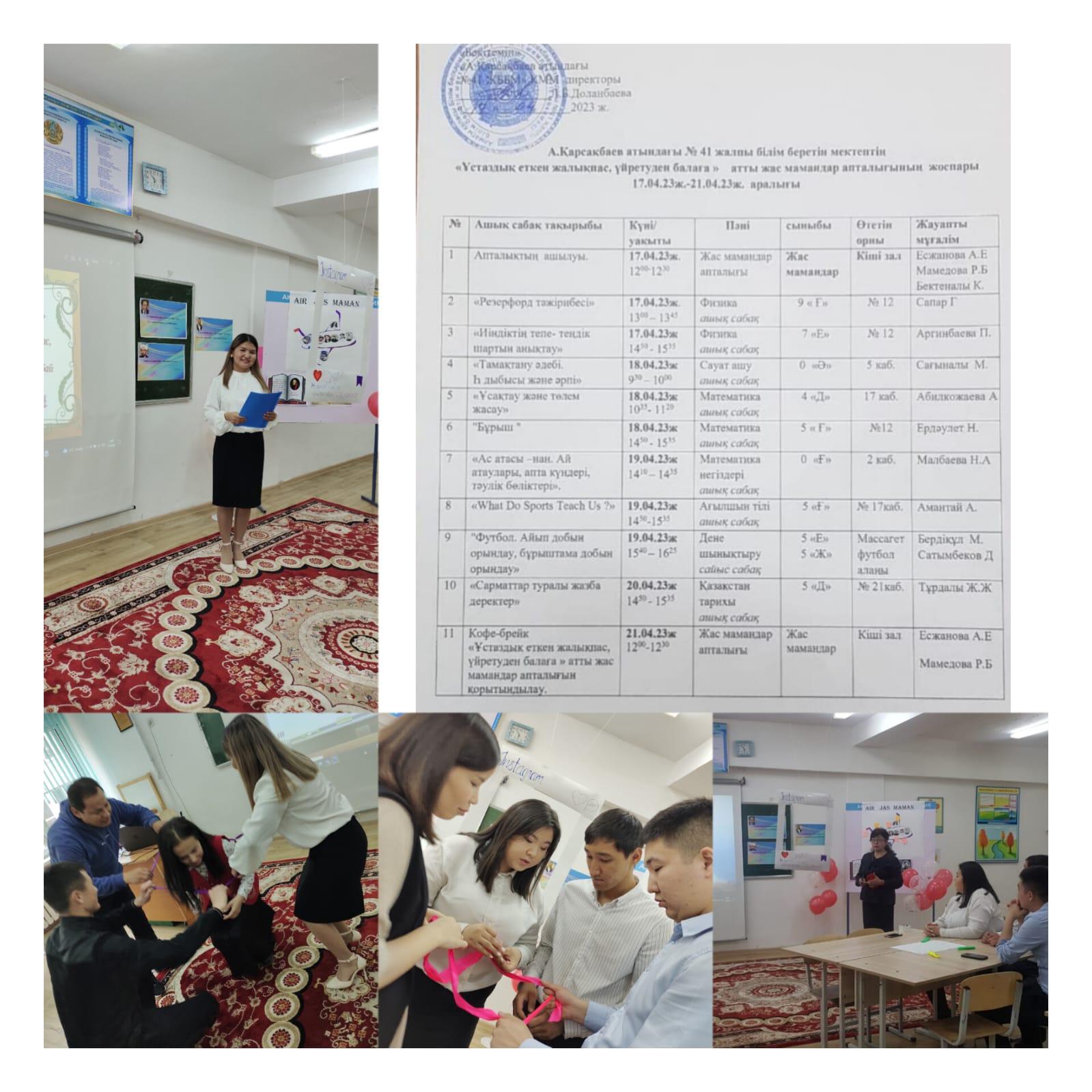 А.Қарсақбаев атындағы № 41 жалпы білім беретін мектебінде 17.04-21.04.2023 ж. аралығында «Ұстаздық еткен жалықпас үйретуден балаға» атты жас мамандар апталығы басталды.