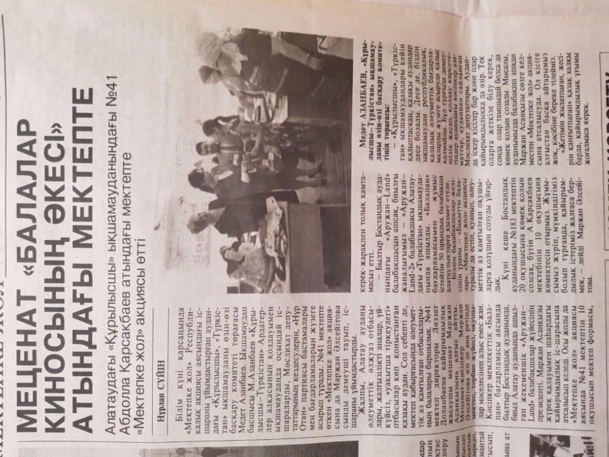 Абдолла Қарсақбаев атындағы №41 жалпы білім беретін мектепте 01.08-31.09.2017 ж аралығында "Мектепке жол" акциясы өтіп жатыр. Акция аясында всеобучтан аз қамтылған, көп балалы, жетім, жартылай жетім отбасынан шыққан 60 оқушыға мектеп формасы берілді. Демеушілер "Кенжехан" базарының әкімшілігі атынан 6 оқушыға мектеп формасы, аяқ киім және "Аружан" балабақшасының директоры атынан 10 оқушыға мектеп формасы, кеңсе тауарлары, мектеп сумкалары берілді. Сонымен қатар, "Мектепке жол" акциясы кезінде демеушілердің көрсеткен көмектері "Алматы ақшам" газетіне басып шығарылды және СТВ каналында көрсетілді.