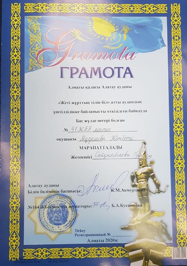 А.Қарсақбаев атындағы №41 жалпы білім беретін мектептің 11"А" сынып оқушысы Мұқашева Жанбота Алатау ауданы бойынша орта білім беру ұйымдарының қазақ, орыс және ағылшын тілдерін жетік меңгерген 11сынып оқушылары арасында өткен "Жеті жұрттың тілін біл" байқауынан бас жүлдені жеңіп алып қалалық байқауға жолдама алды.