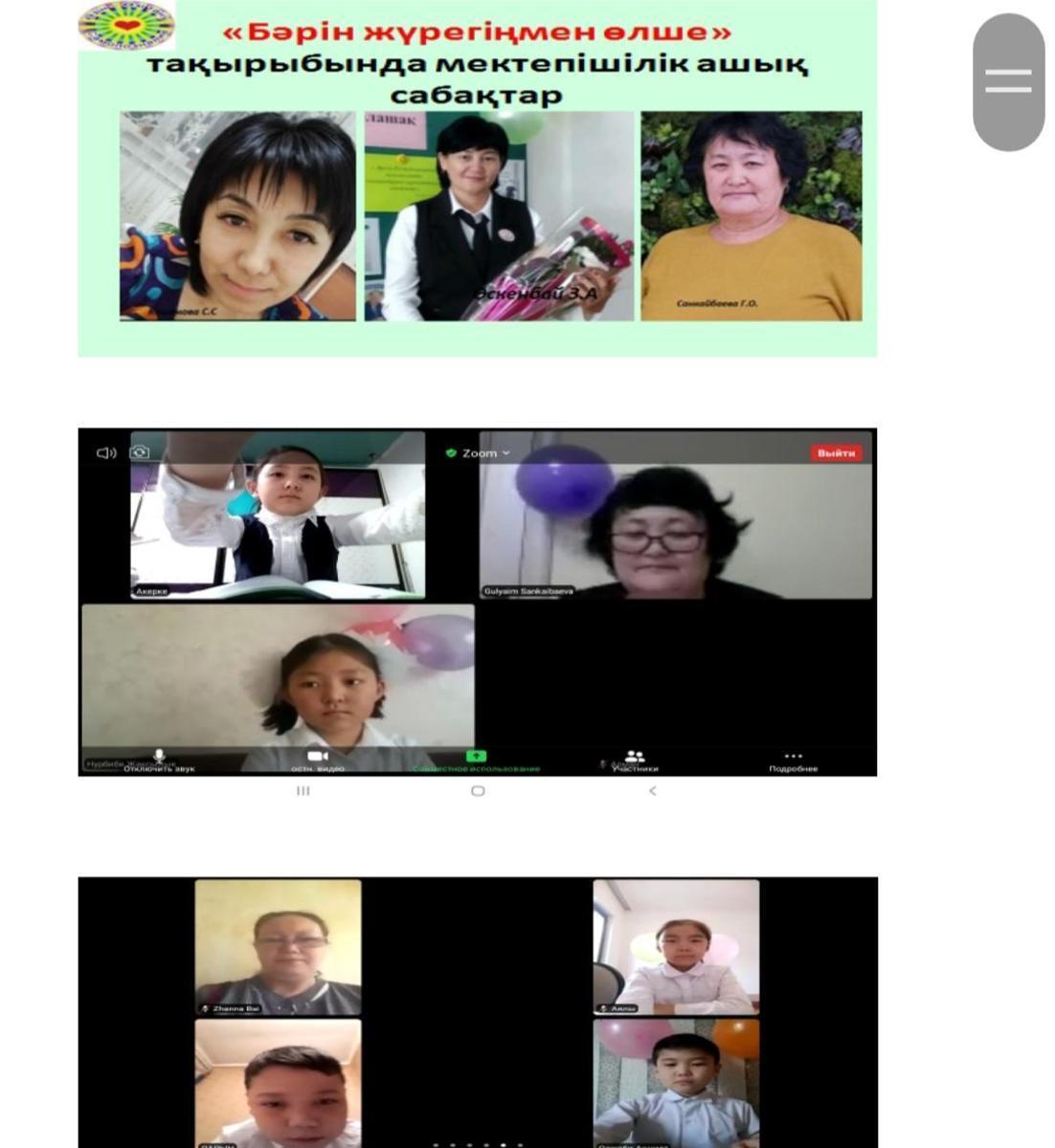 онкүндігінің аясында жүргізілген жұмыс 08.02-10.02.2021 күні мектебімізде 4 « Г», 9 «Ә»,8 «А» сынып оқушыларымен ZOOM платформасы арқылы Г.Санкайбаева,С.Кошенова , З.Өскенбай «Бәрін жүрегіңмен өлше» тақырыбында мектепішілік ашық сабақтар өткізді.