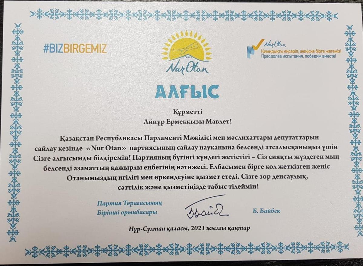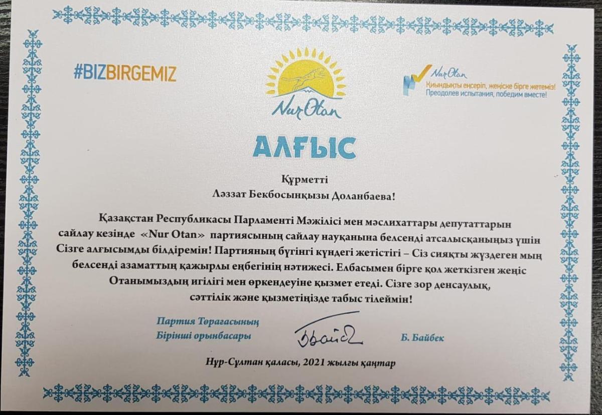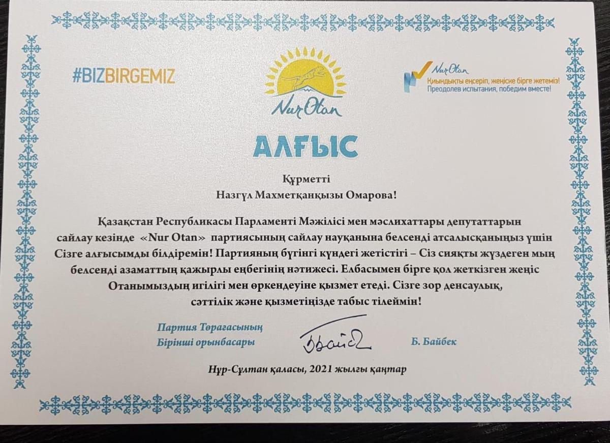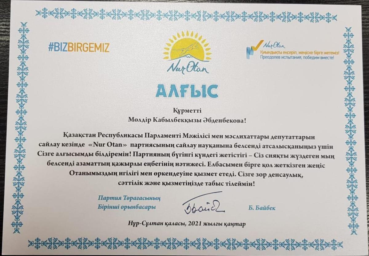 "Нұр Отан" партиясы Төрағасының Бірінші орынбасары Б.Байбек Қазақстан Республикасы Парламенті Мәжілісі мен мәслихаттары депутаттарын сайлауға белсенді қатысқаны үшін А.Қарсақбаев атындағы №41 ЖББ мектебінің бірнеше ұстаздарын Алғыс хаттармен марапаттады. Құттықтаймыз!