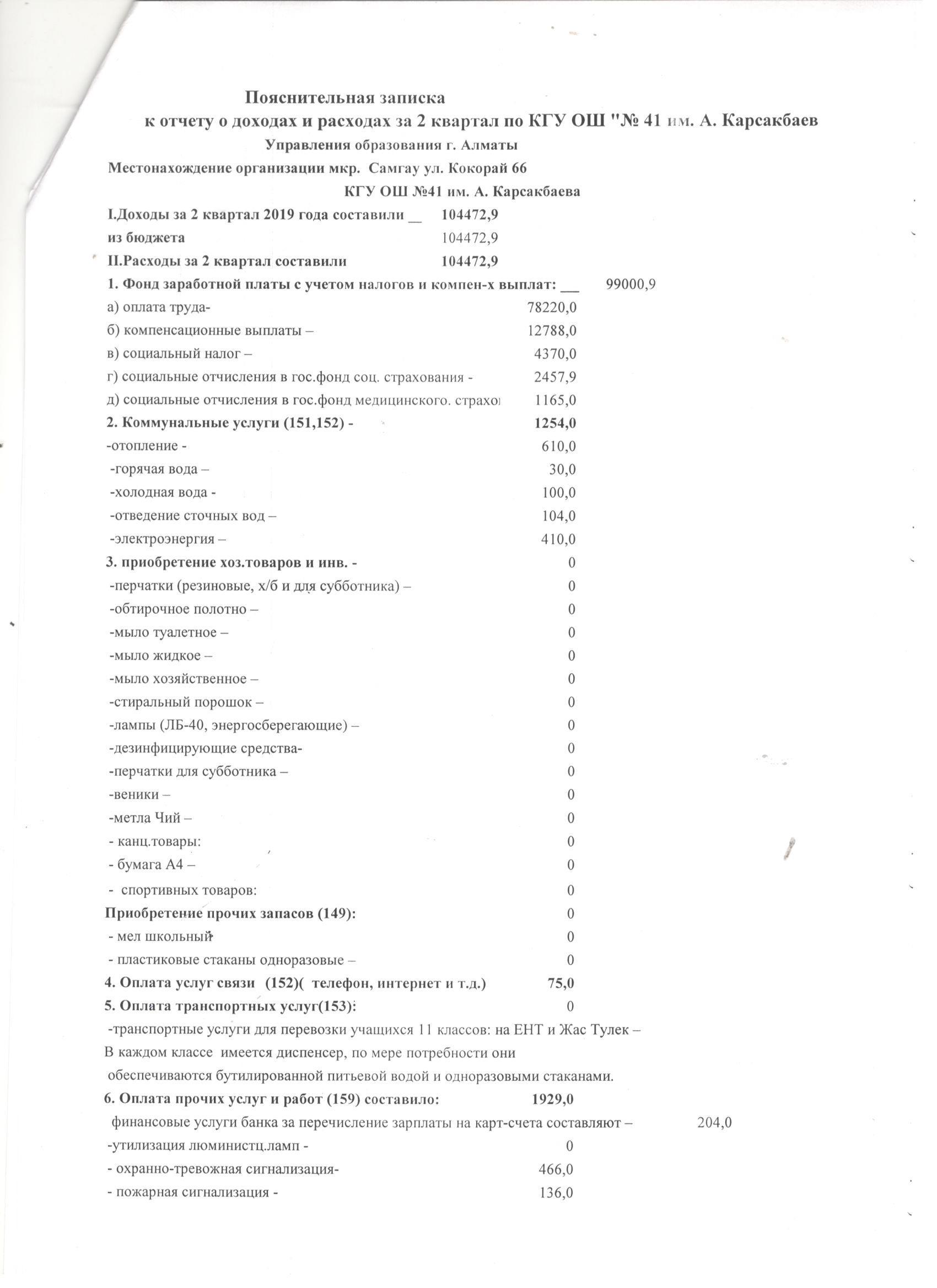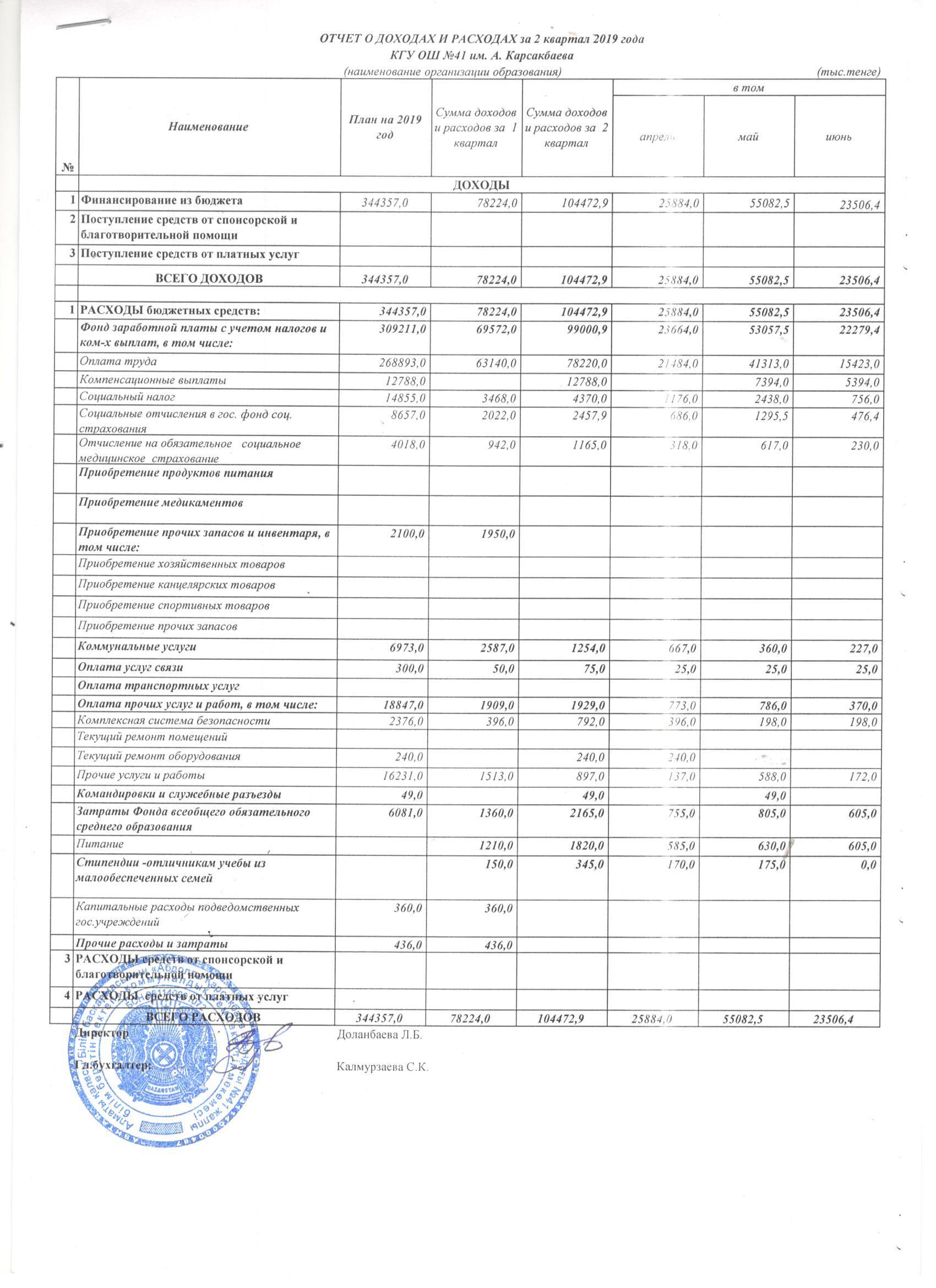 » 2019 жылғы 2 тоқсандағы кірістер мен шығыстар туралы есеп