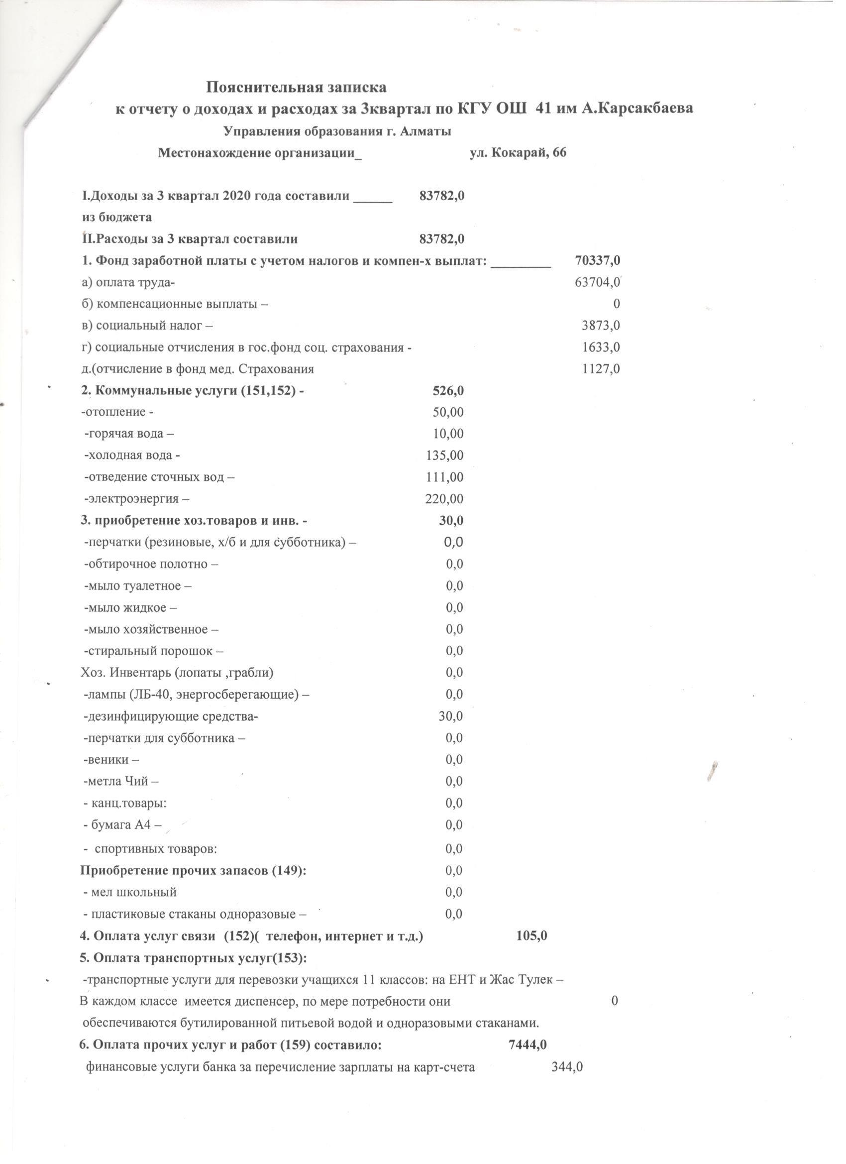 » 2020 жылғы 3 тоқсандағы кірістер мен шығыстар туралы есеп