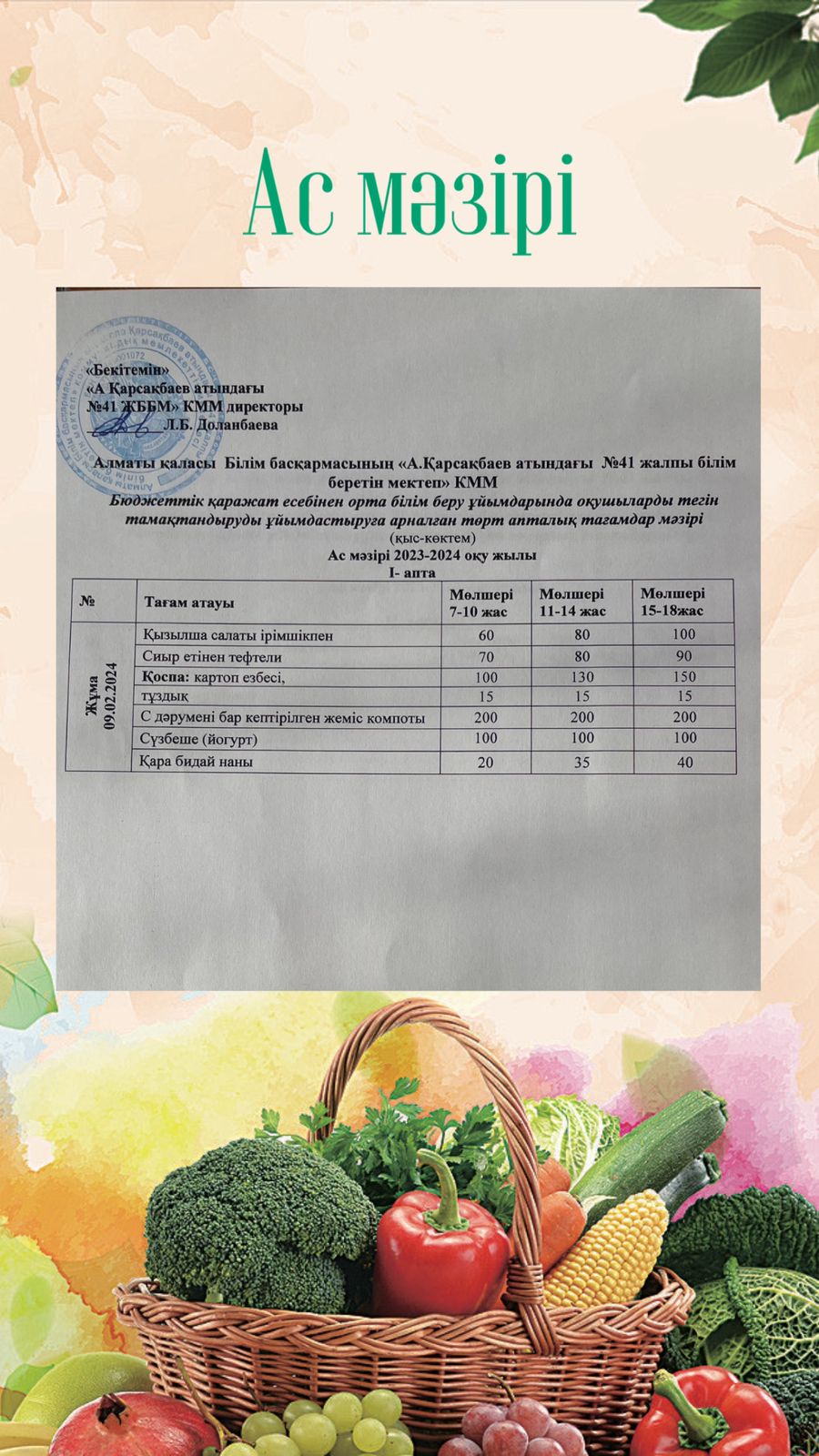 Ас мәзірі 09.02.2024 жыл. I апта V күн.