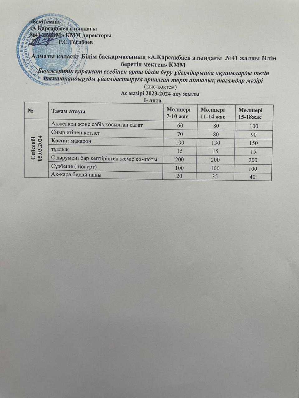 Ас мәзірі 05.03.2024 жыл. I апта II күн.