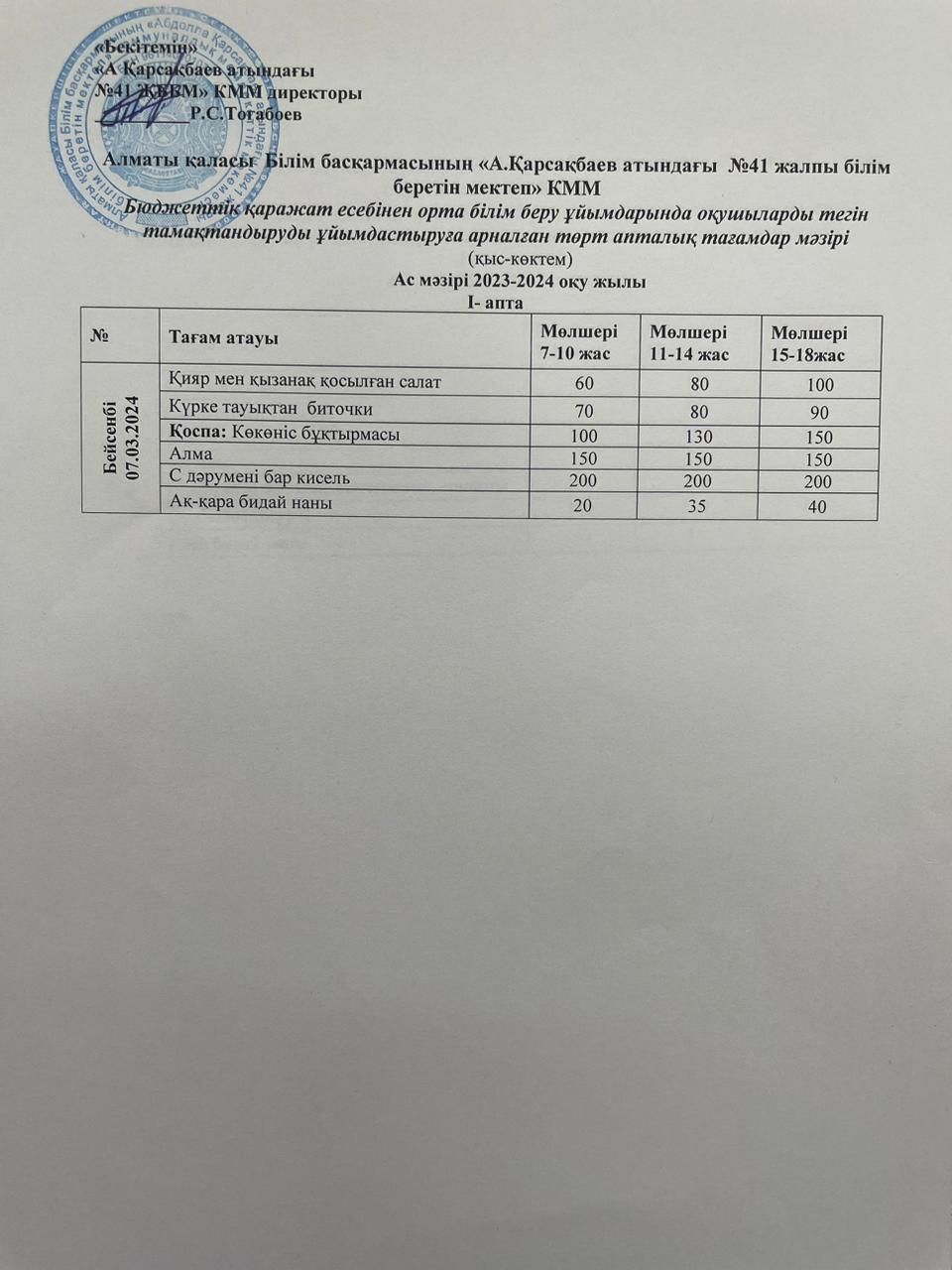 Ас мәзірі 07.03.2024 жыл. I апта IV күн.
