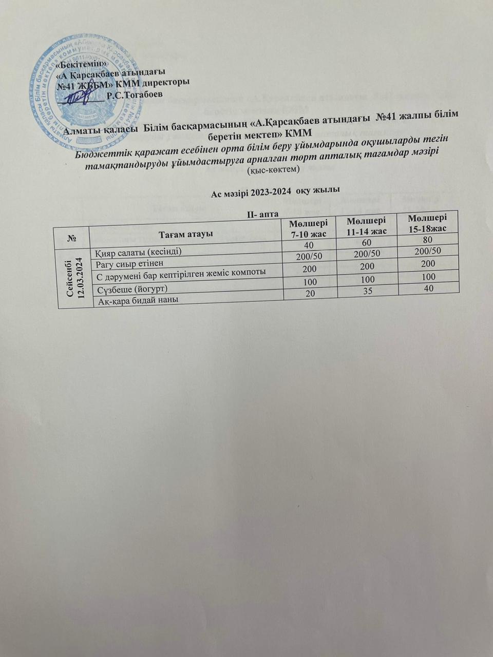 Ас мәзірі 12.03.2024 жыл. II апта II күн.