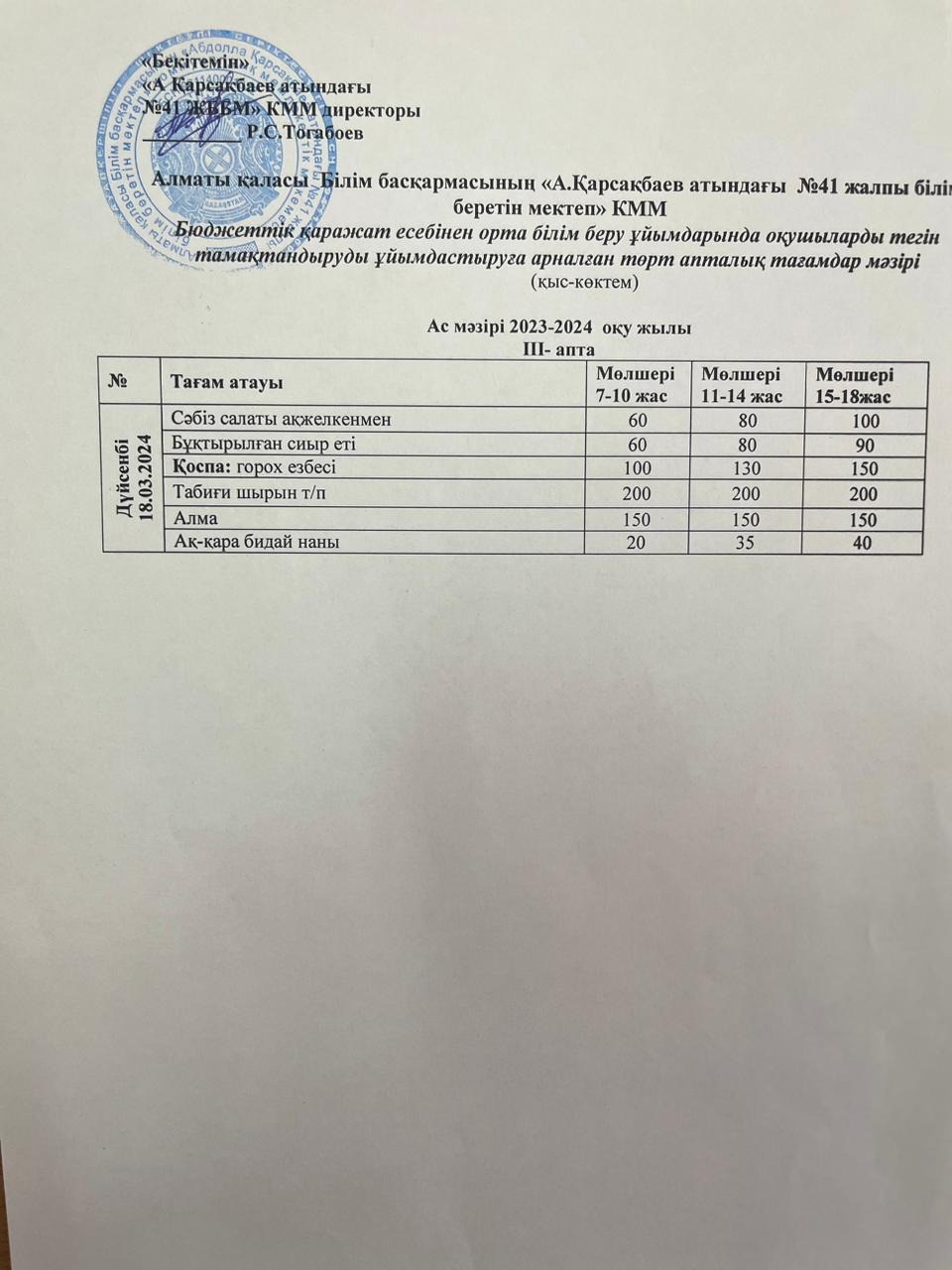 Ас мәзірі 18.03.2024 жыл. III апта I күн.