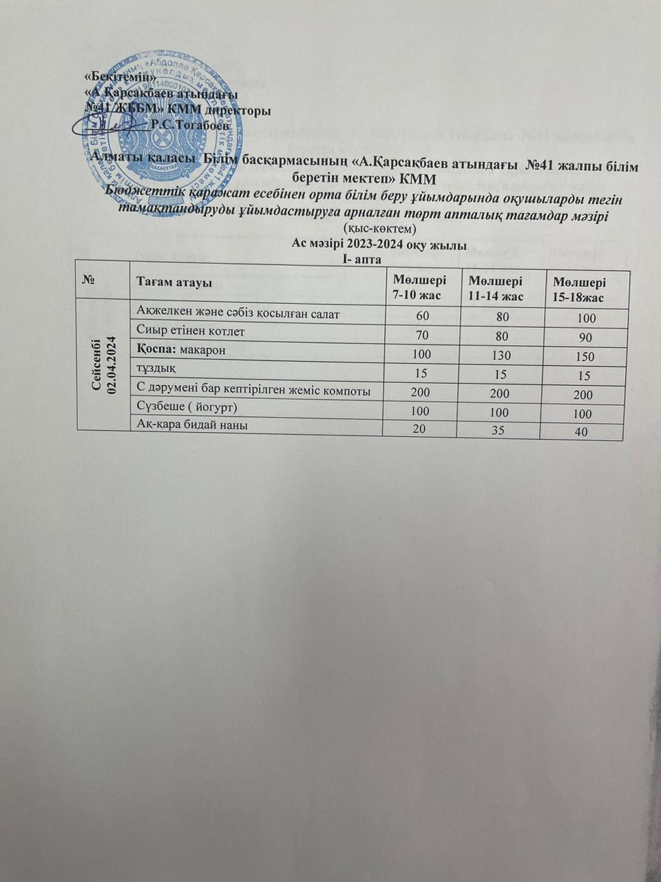 » Ас мәзірі 02.04.2024 жыл. I апта II күн.