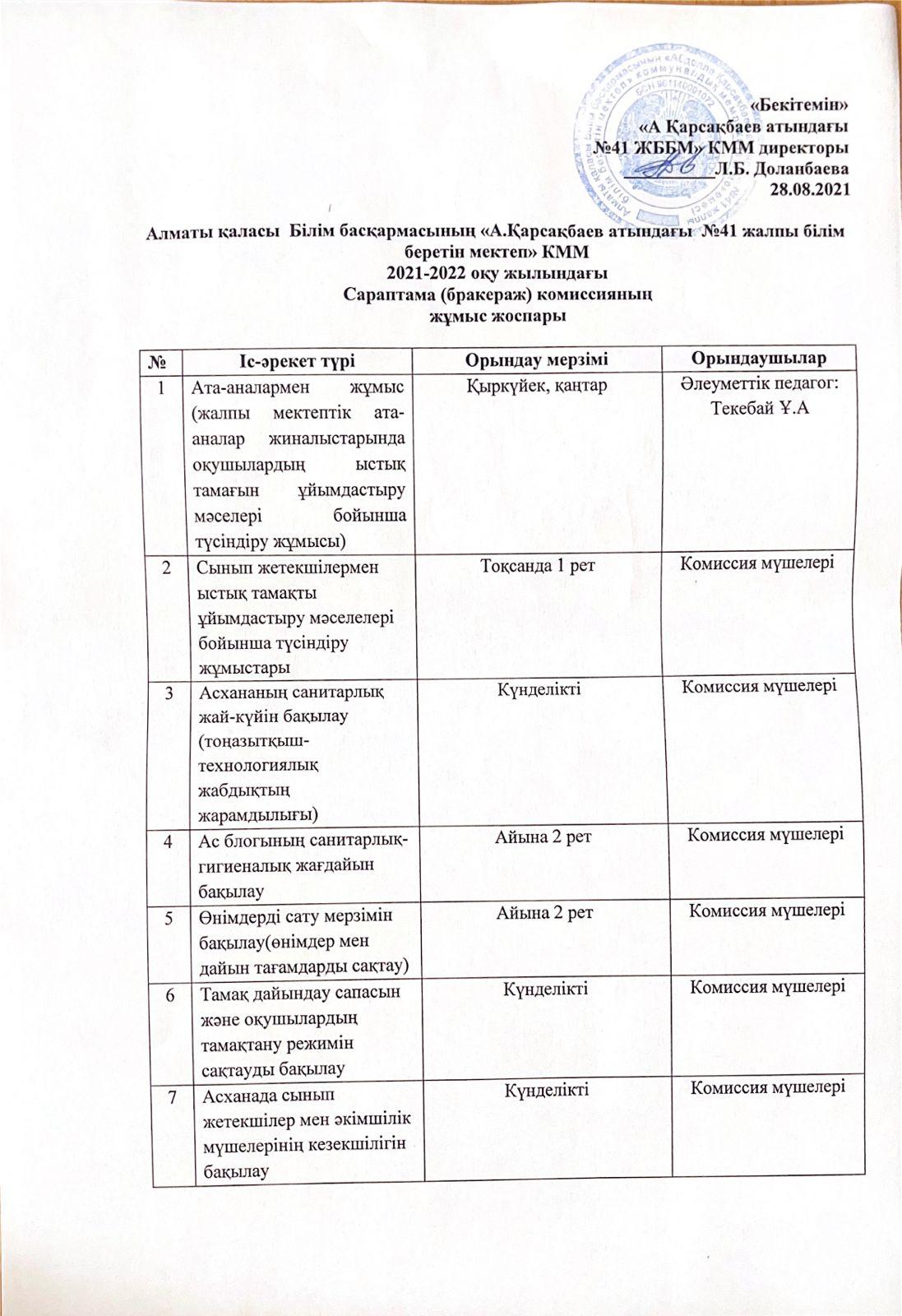 Сараптама (бракераж) комиссиясының жұмыс жоспары 2021-2022ж.ж