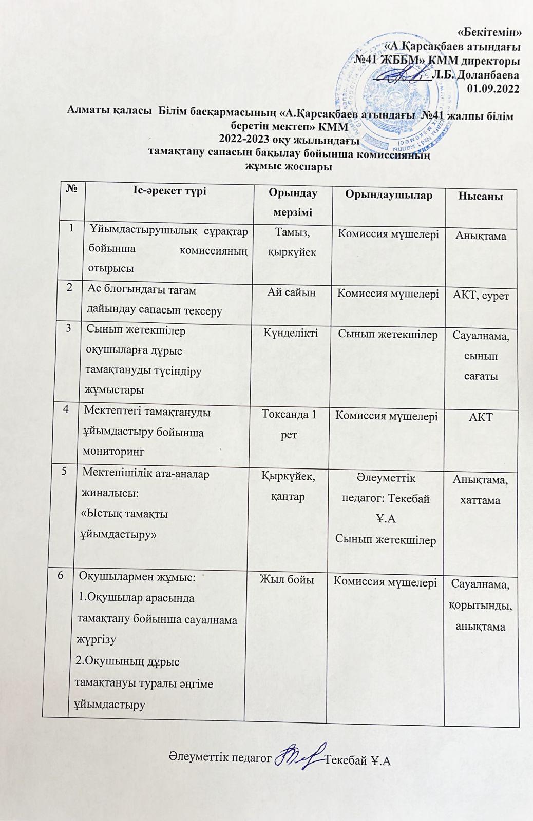 01 қыркүйек 2022 0 1 2 3 4 5 Тамақтану сапасын бақылау бойынша комиссияның жұмыс жоспары 2022-2023 оқу жылы