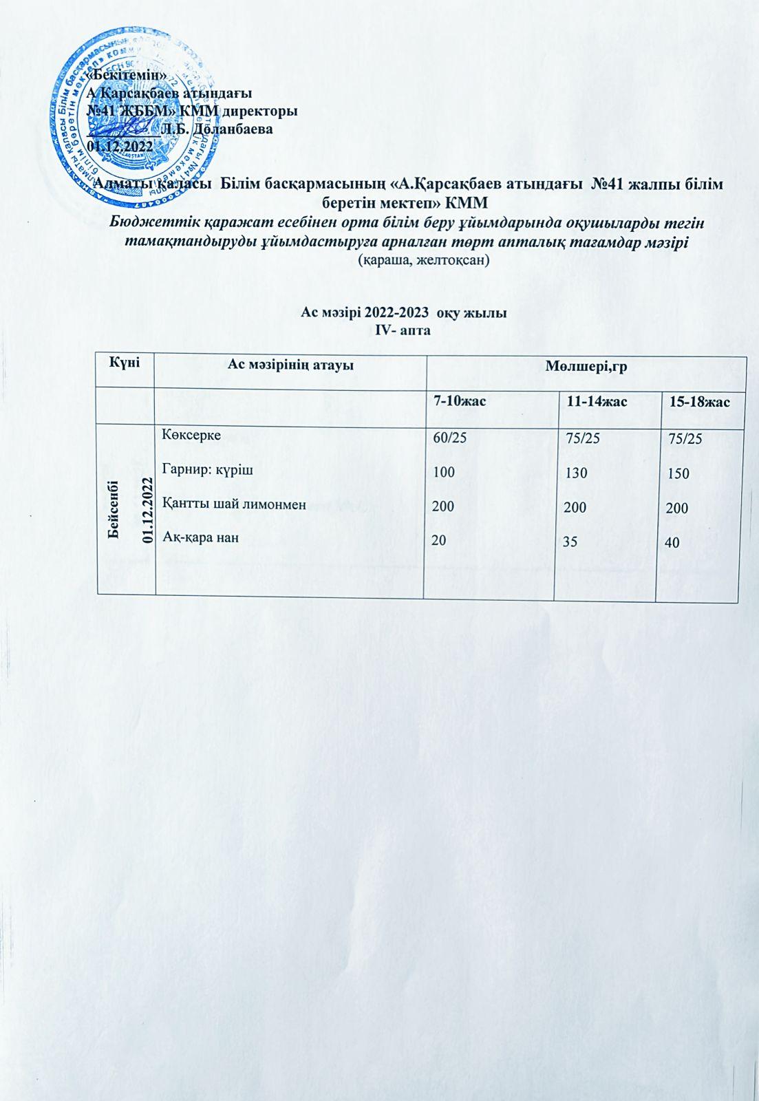 Перспективалық ас мәзірі 2022-2023 оқу жылы (қыркүйек,қазан, қараша,желтоқсан)